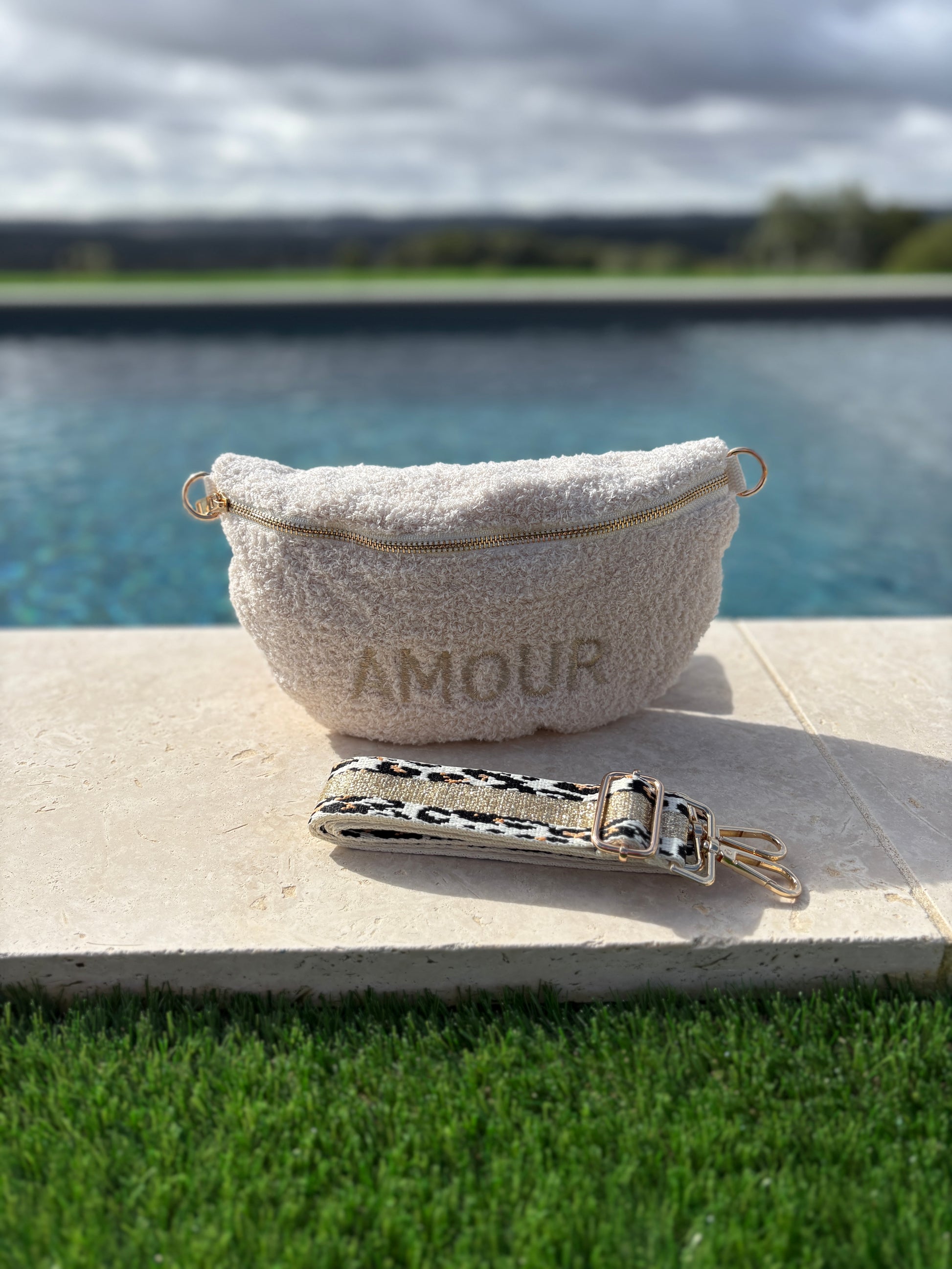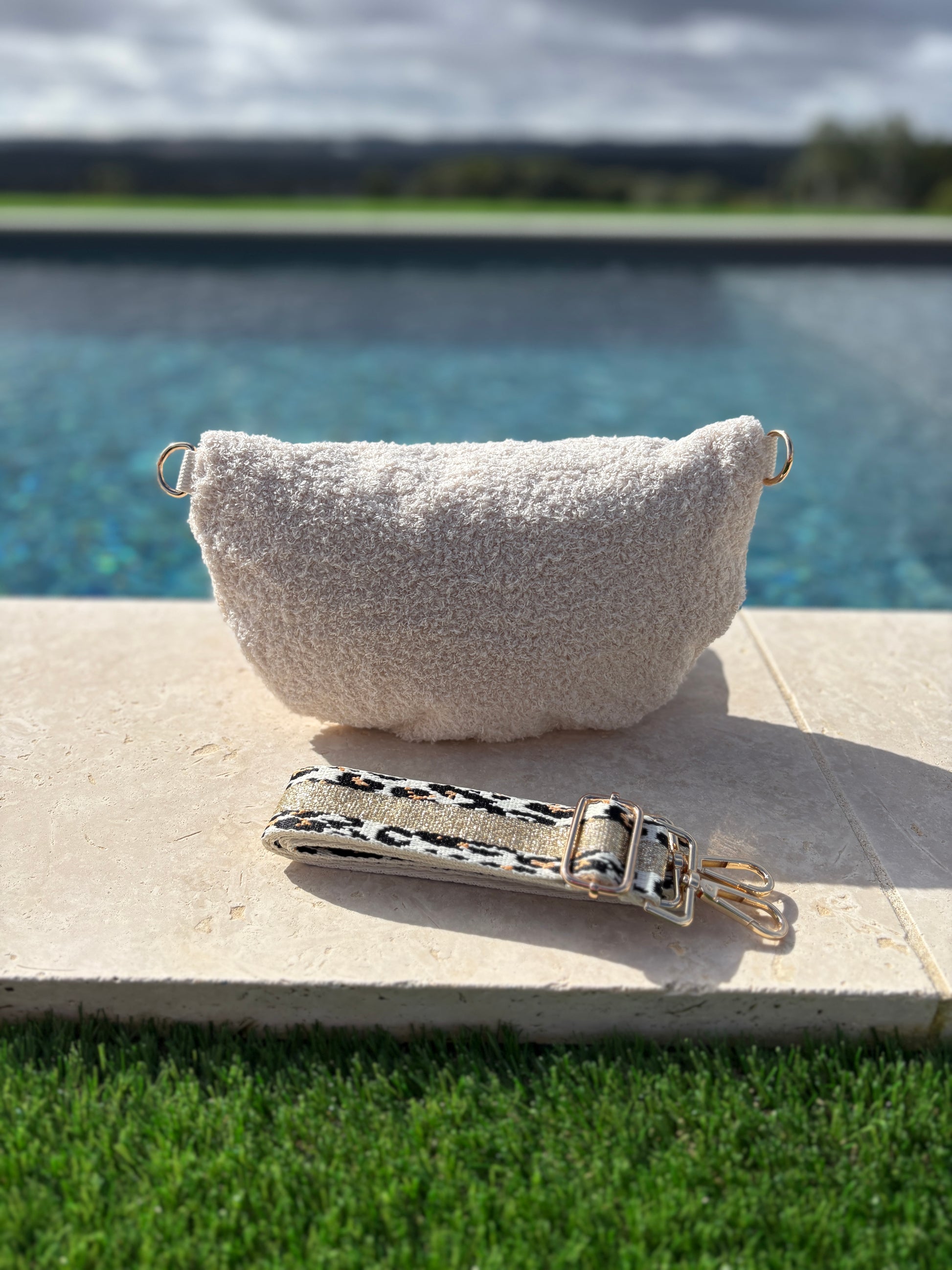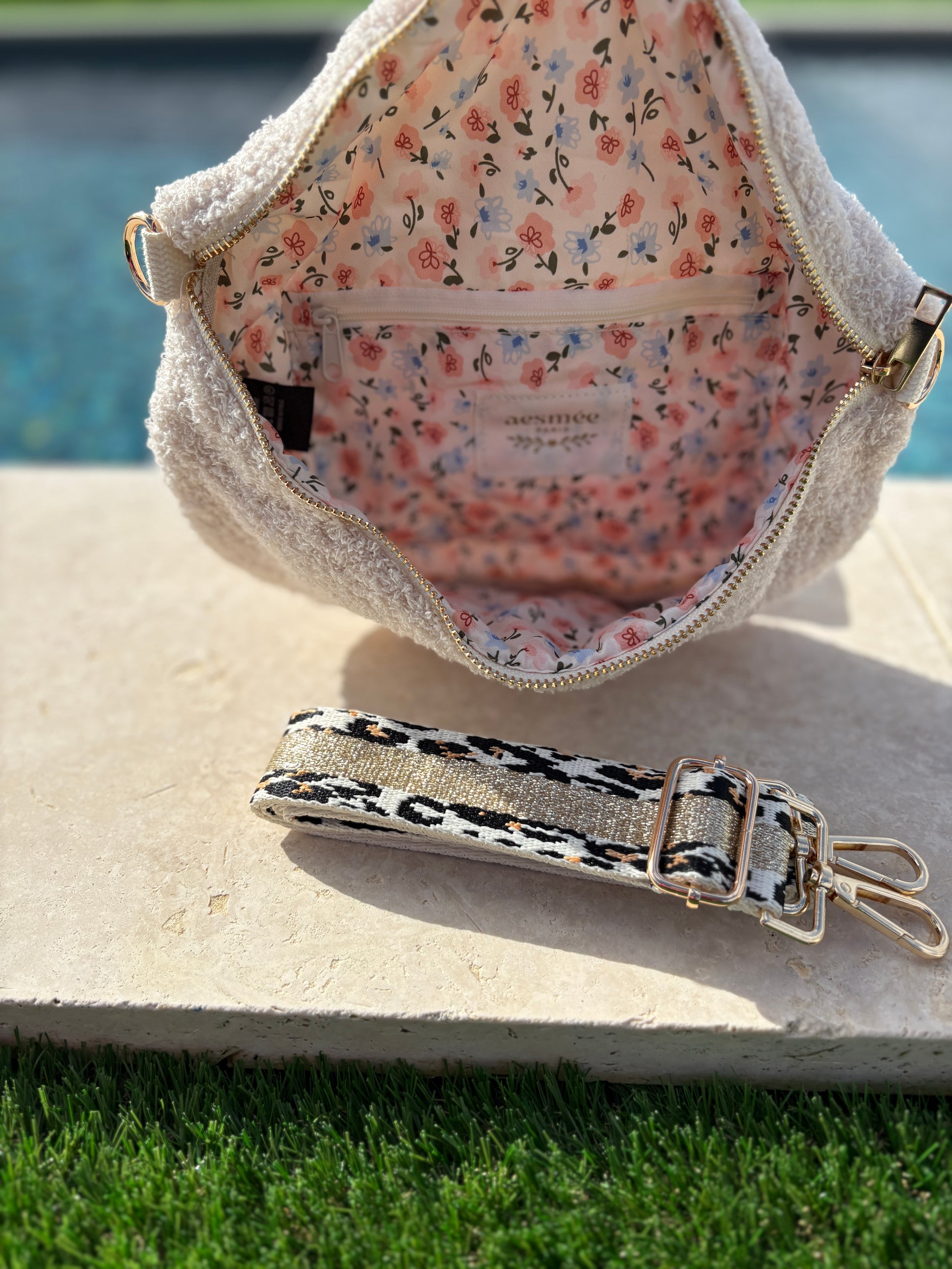 Sac banane en tissu moumoute douce bouclette beige inscription "AMOUR" sangle fantaisie léopard