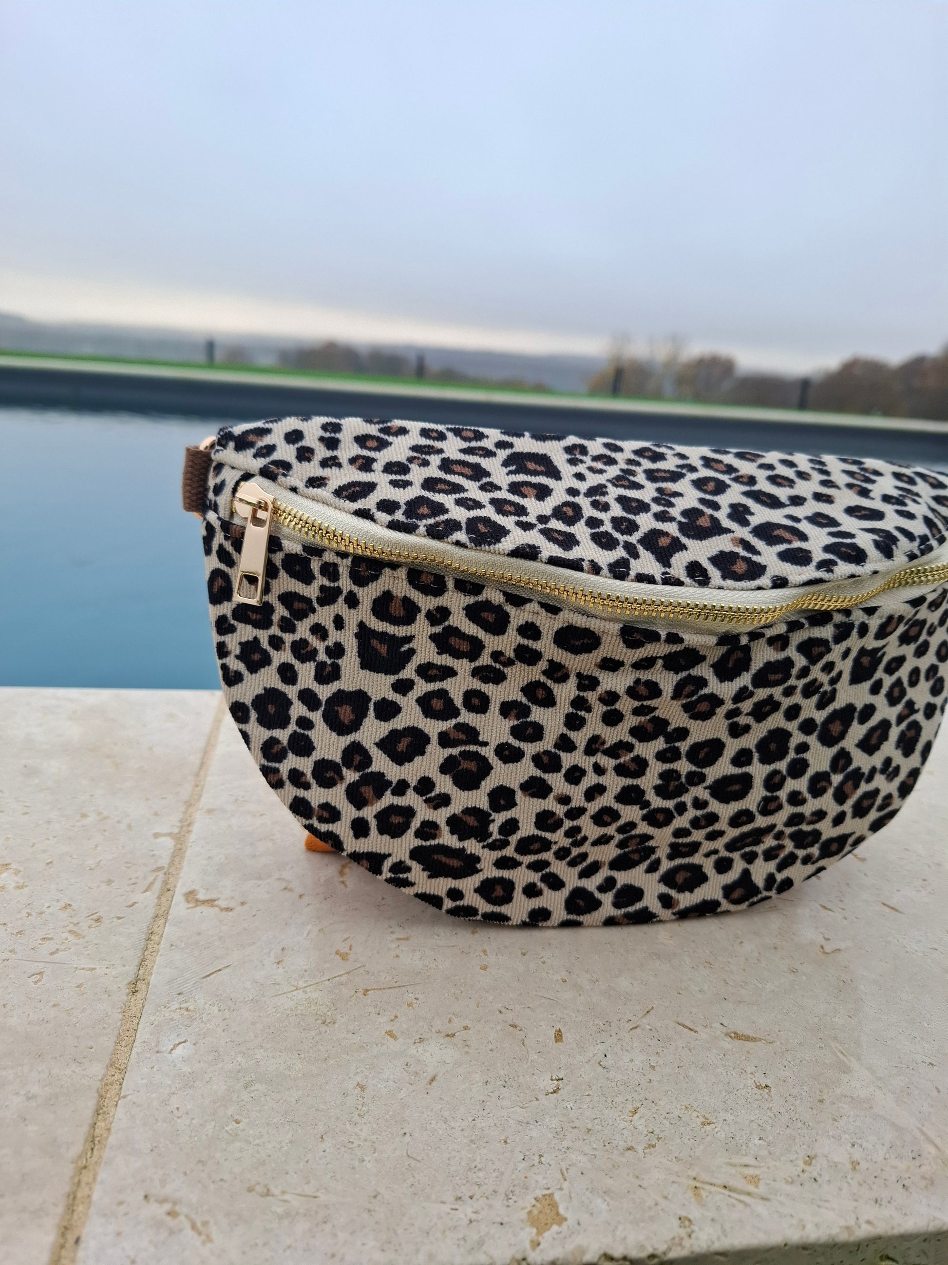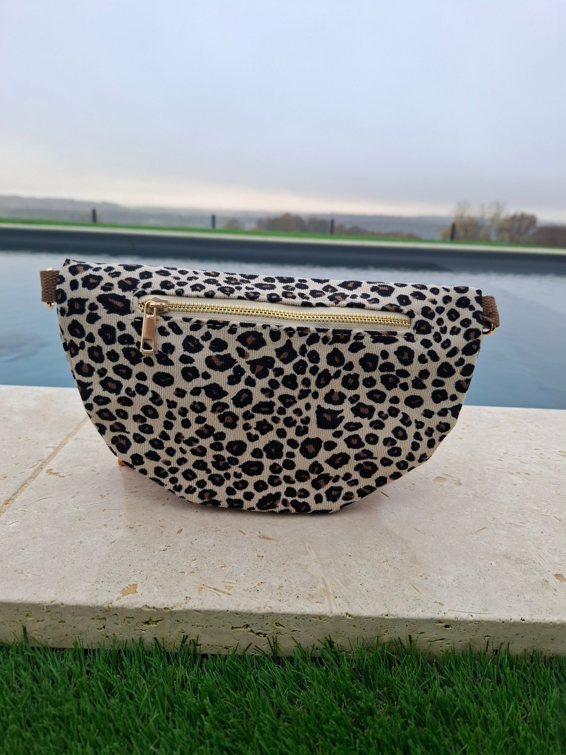Sac banane en velours côtelé beige imprimé léopard noir et marron