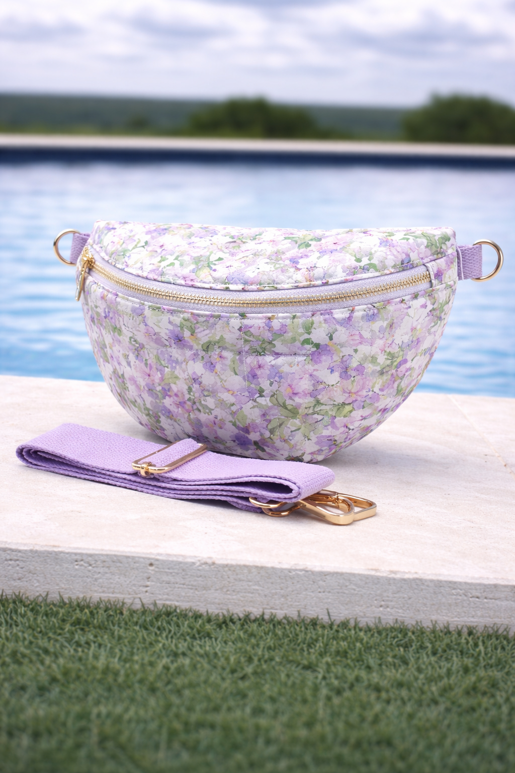 Sac Banane Fleuri Parme – Tissu Matelassé Blanc & Sangle Parme
