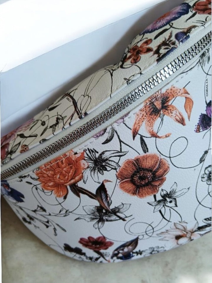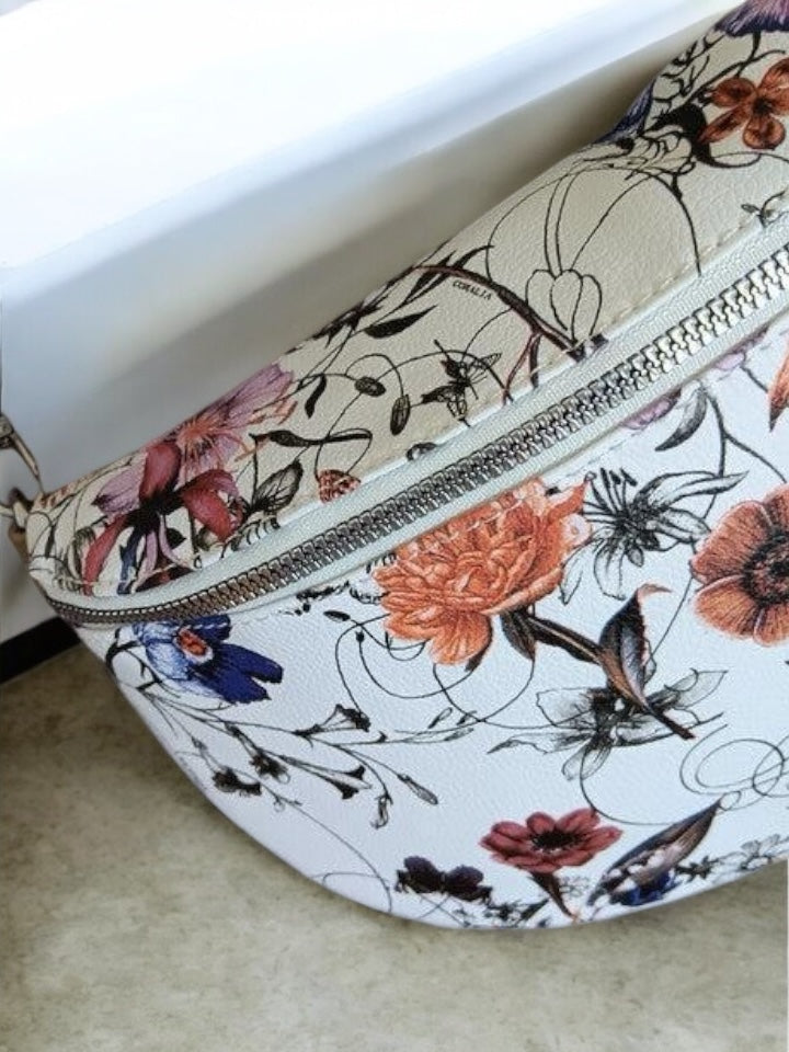 Portez ce sac banane simili cuir fleuri multicolore et taupe d’une très belle qualité.