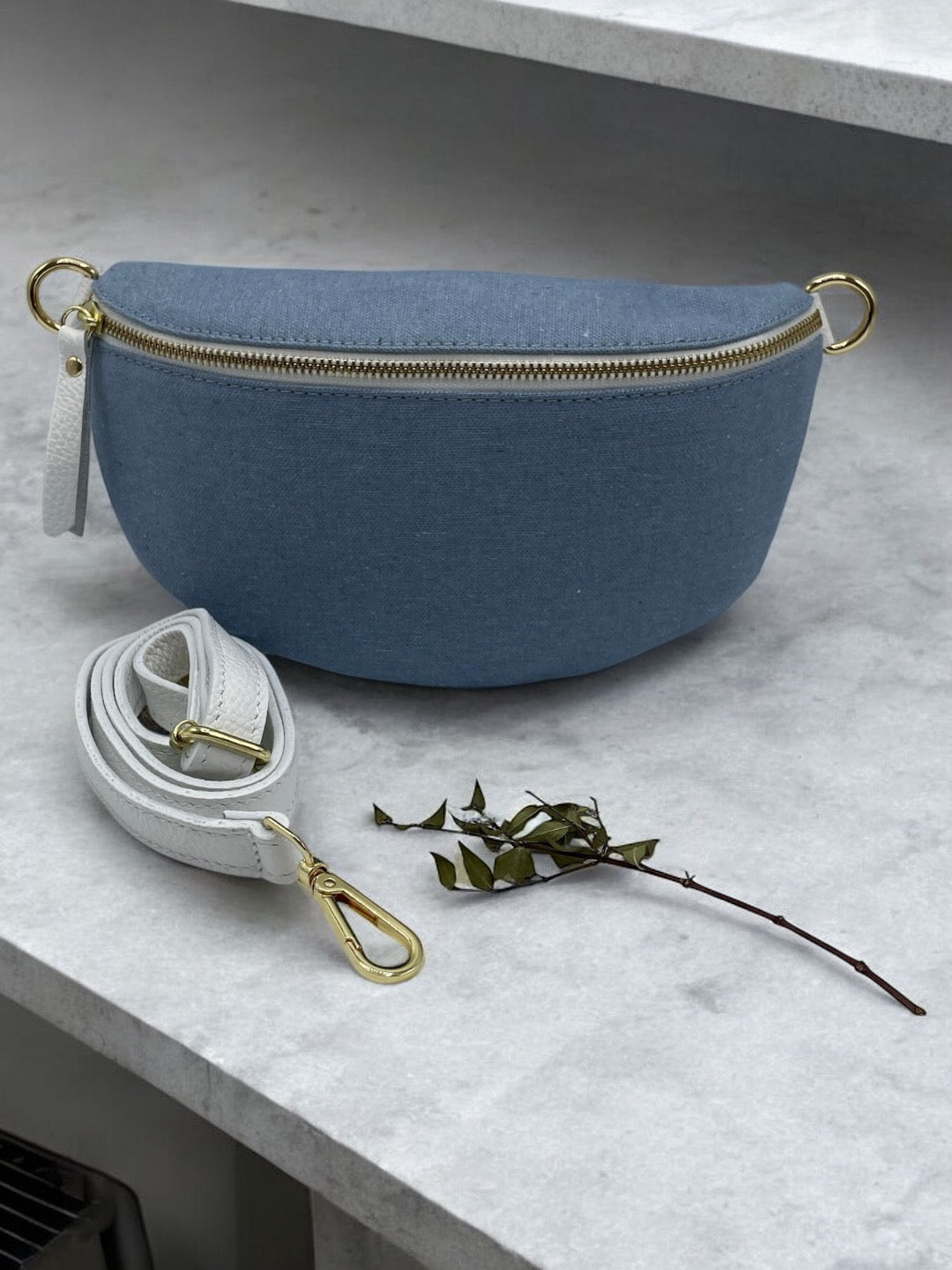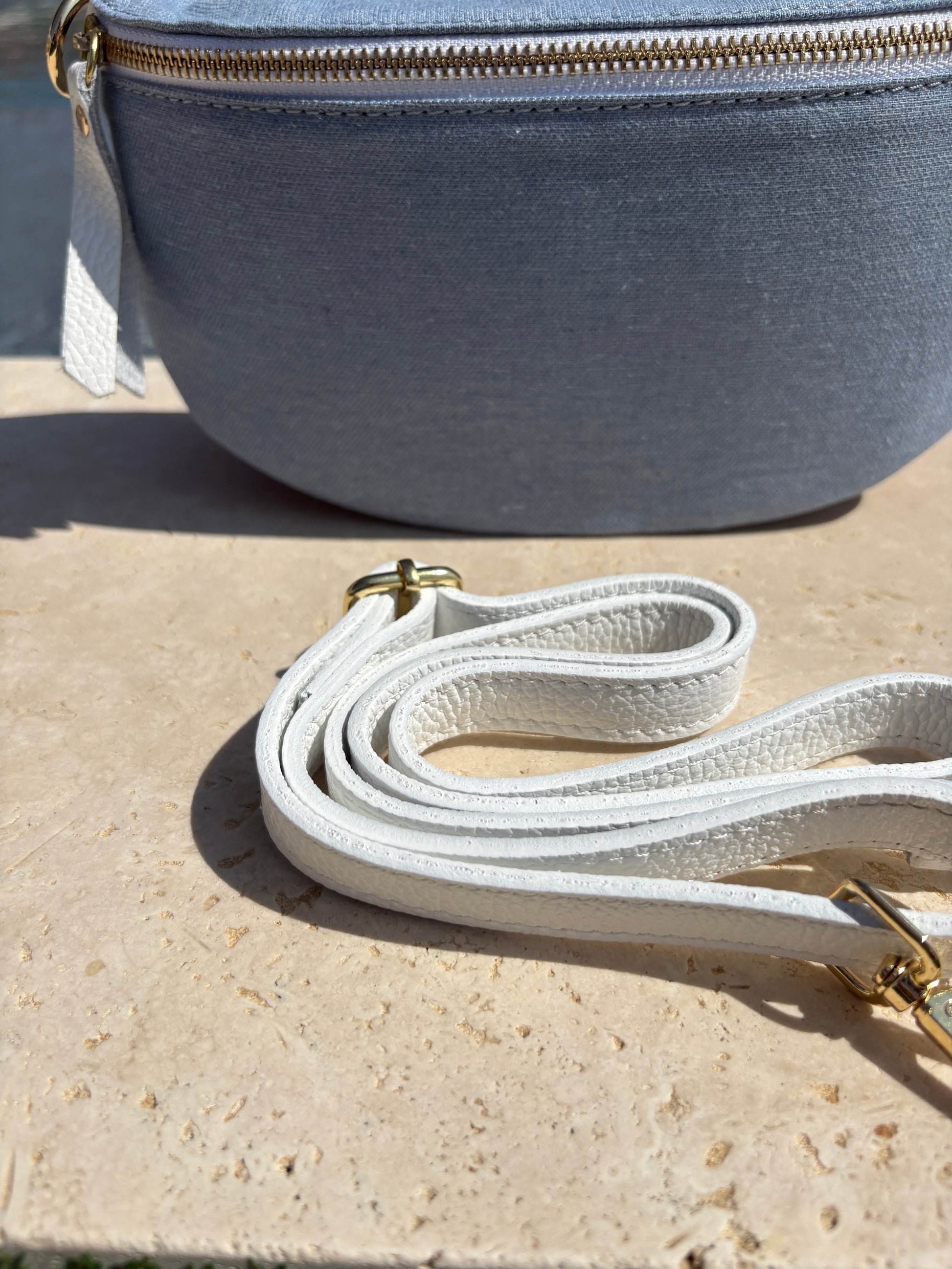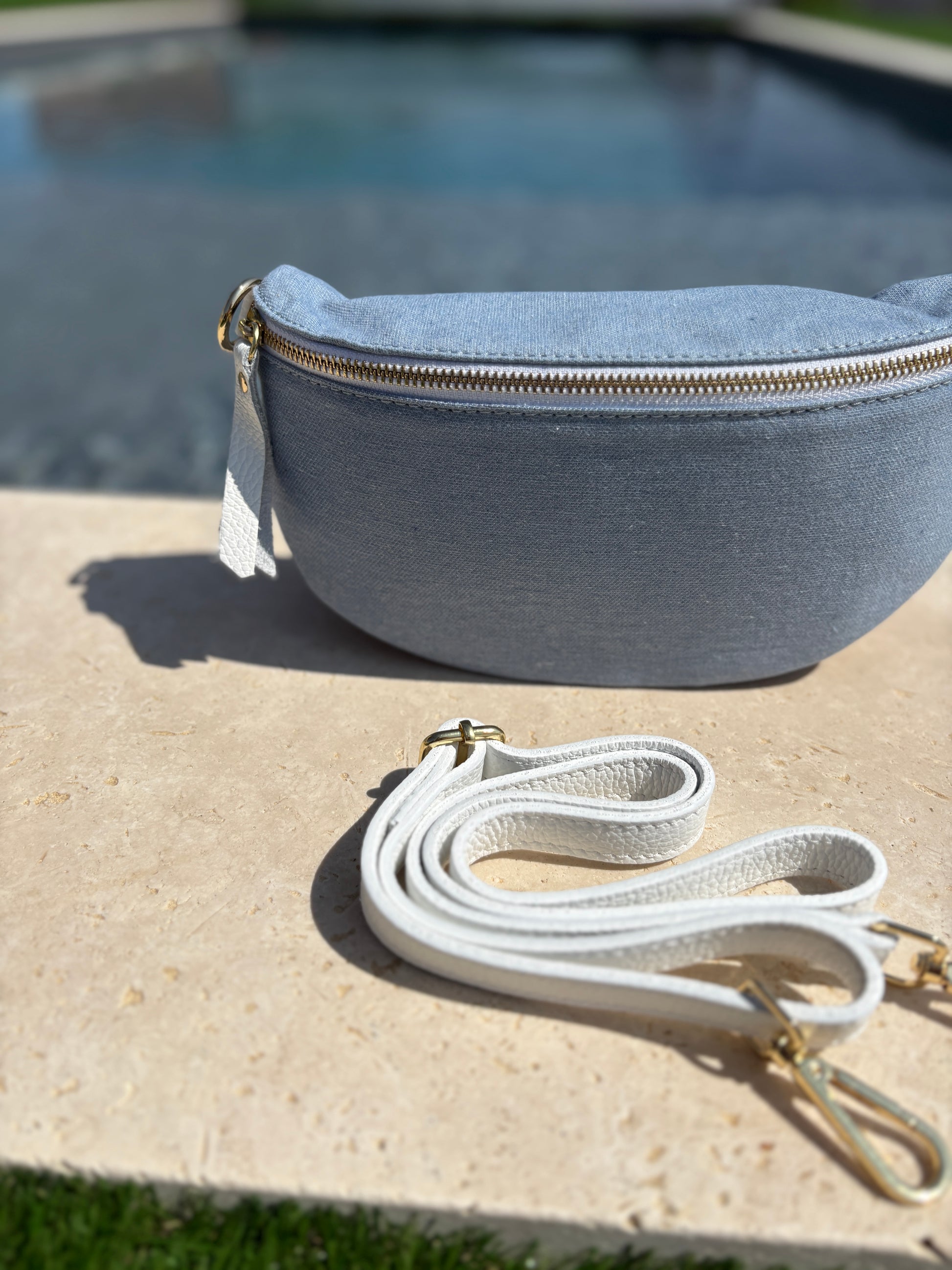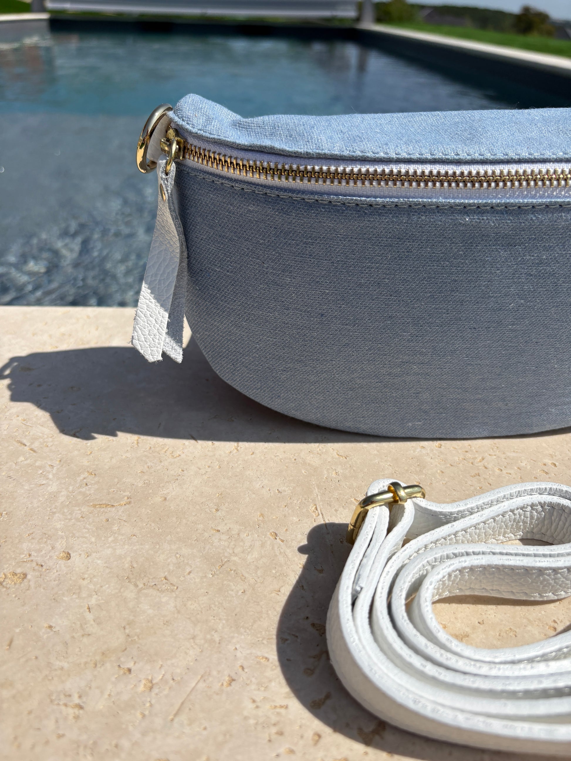 Adoptez le style décontracté et tendance avec le sac banane tissu jean bleu clair et sa bandouliere blanche en cuir !