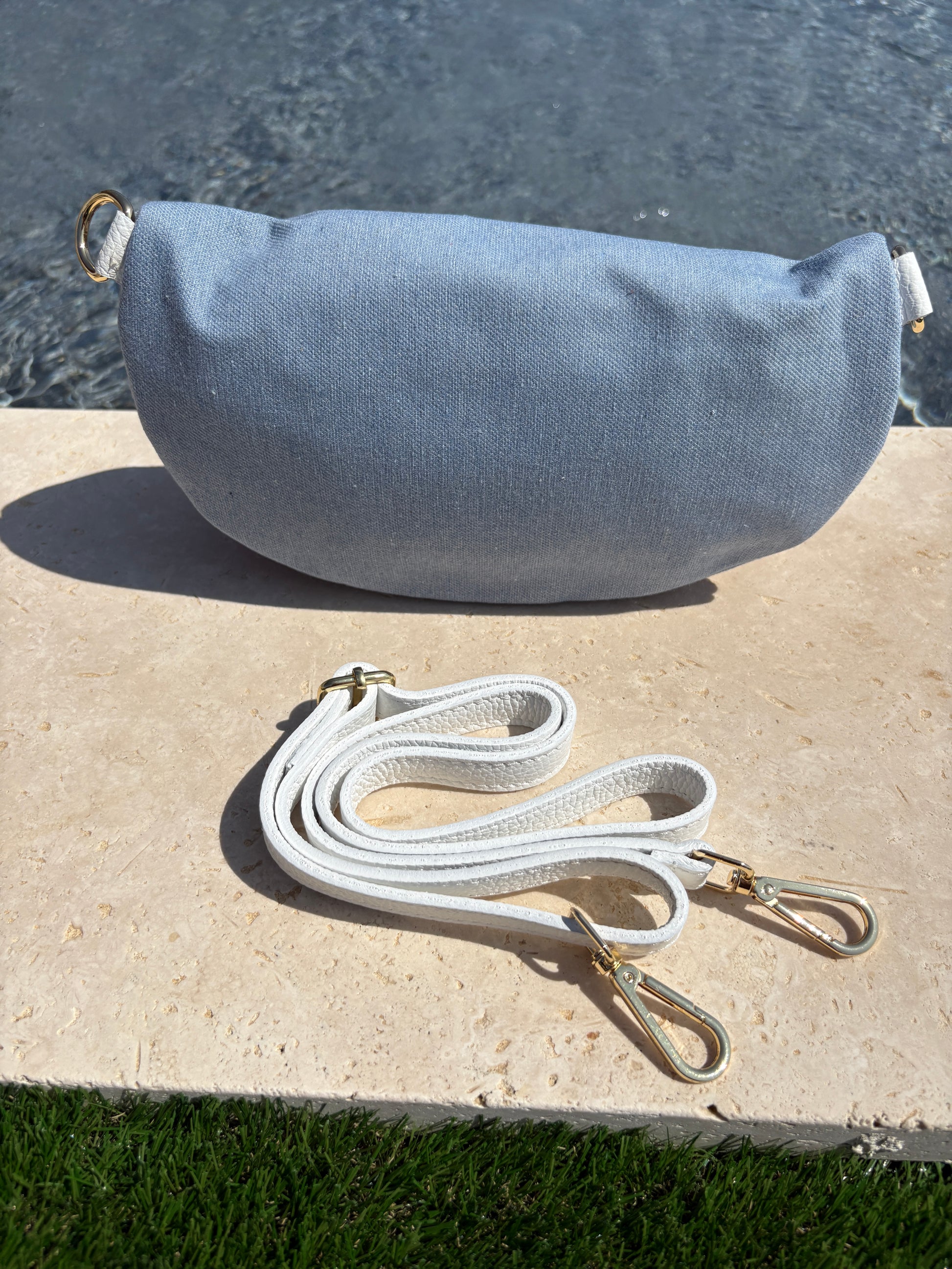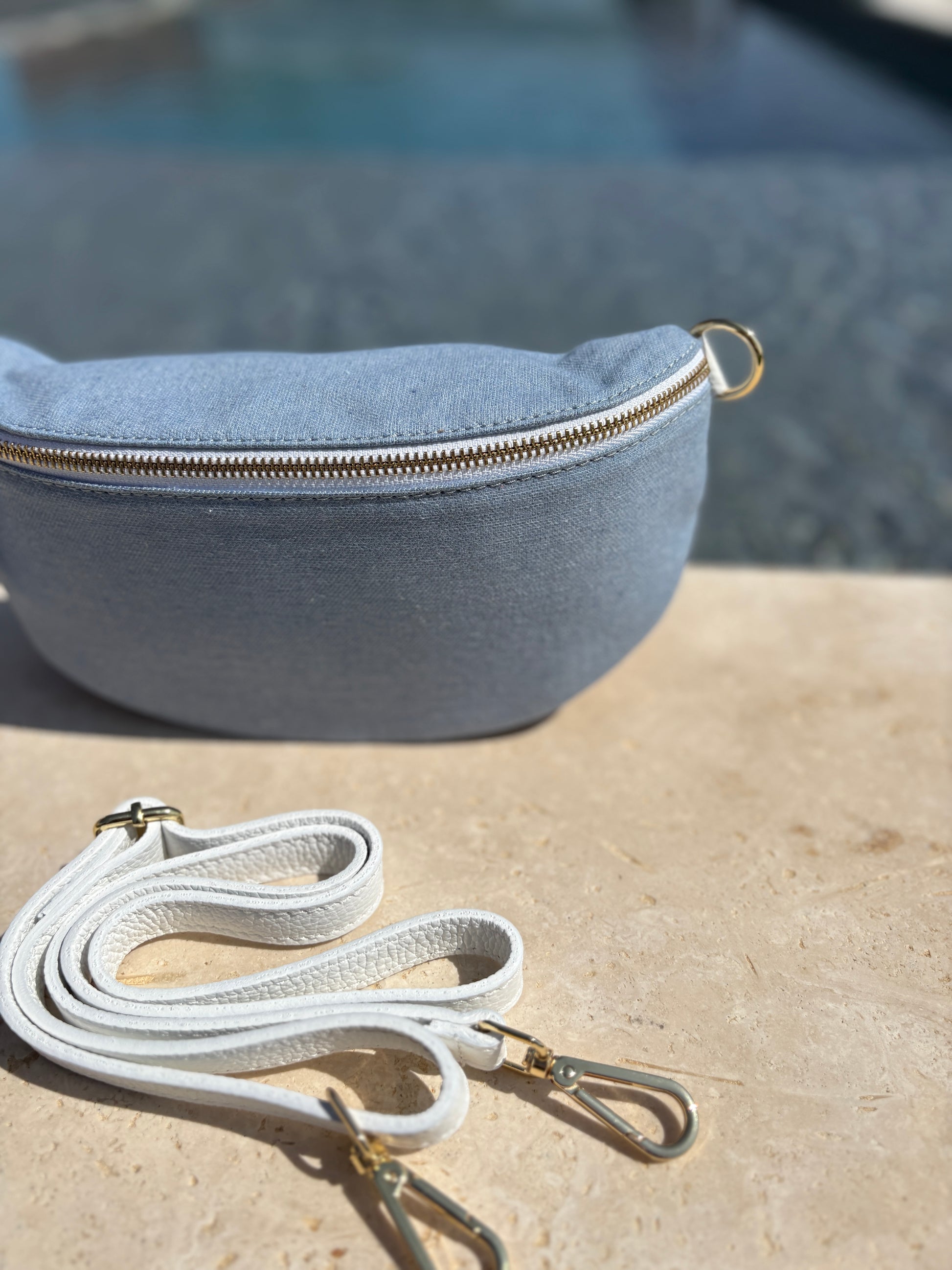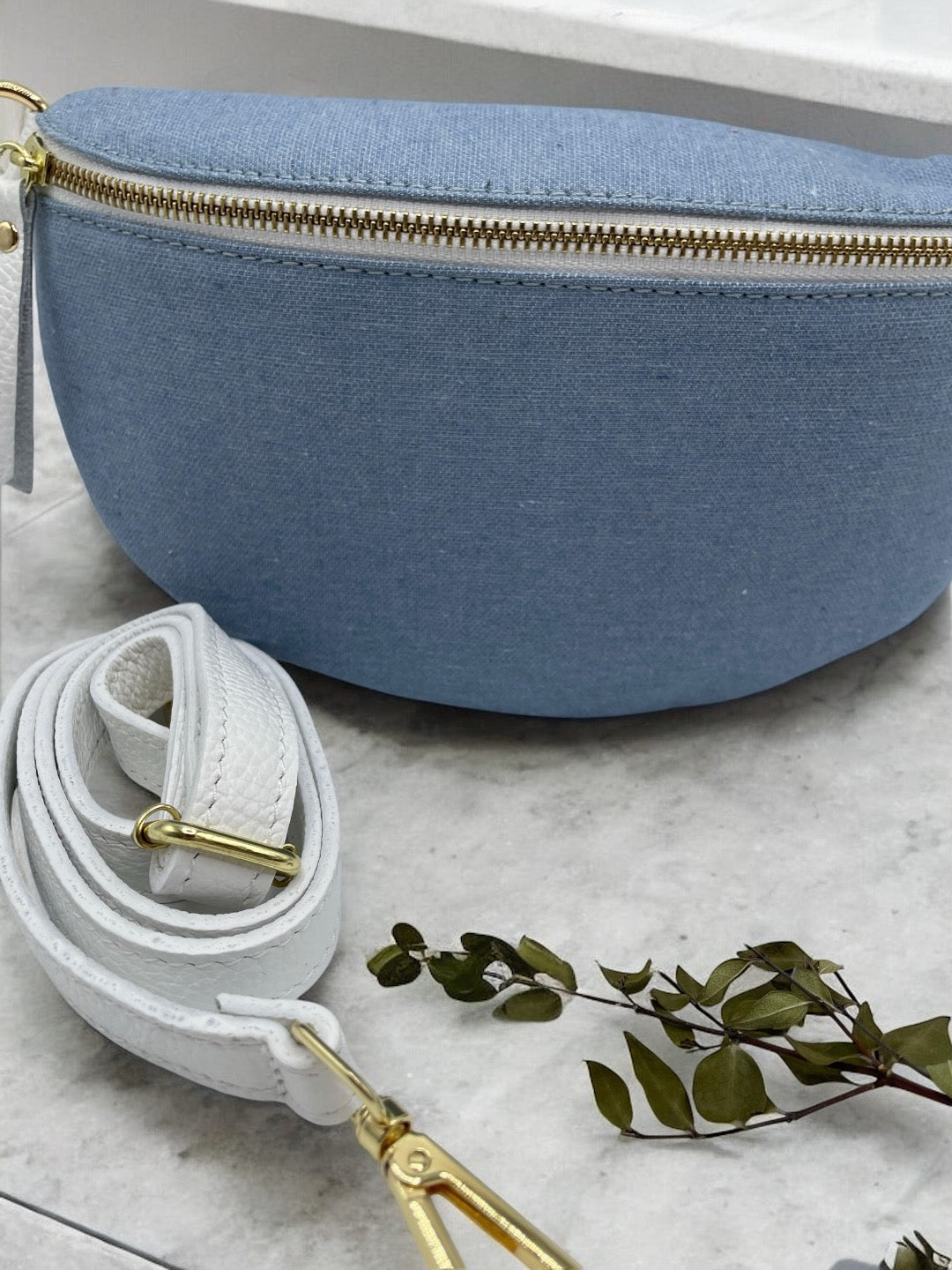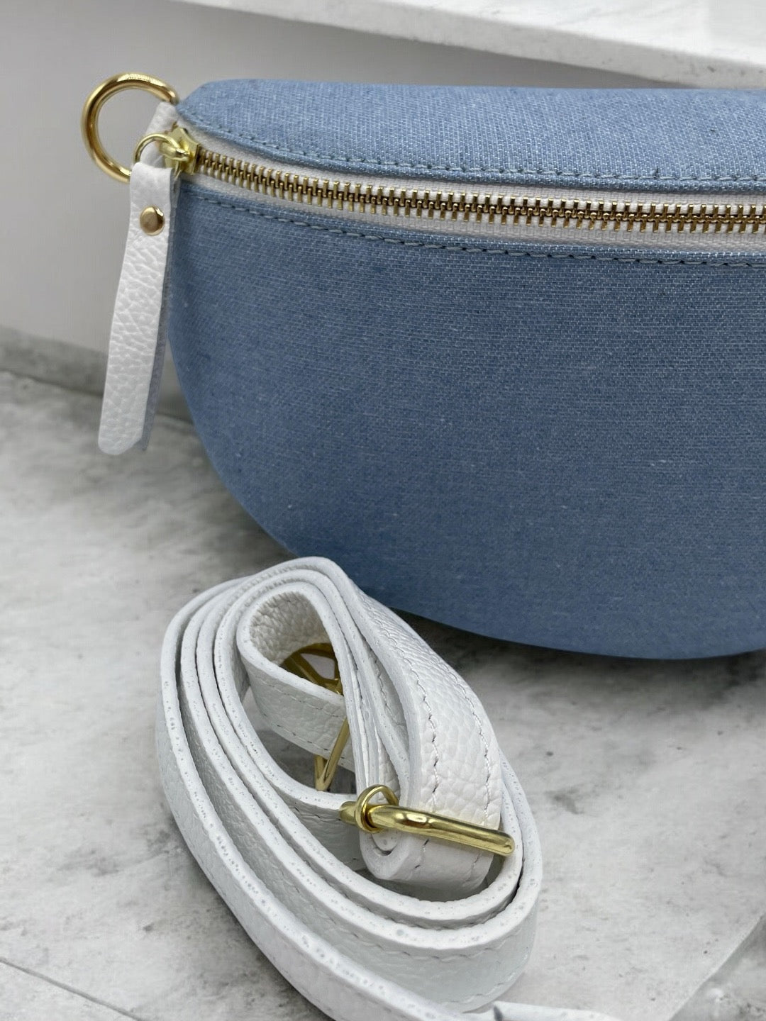 Adoptez le style décontracté et tendance avec le sac banane tissu jean bleu clair et sa bandouliere blanche en cuir !