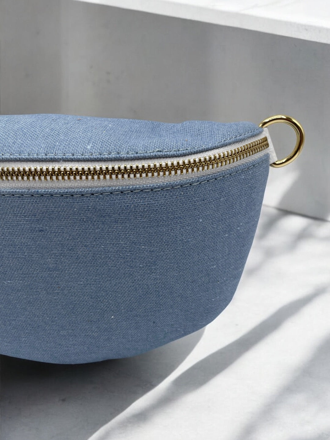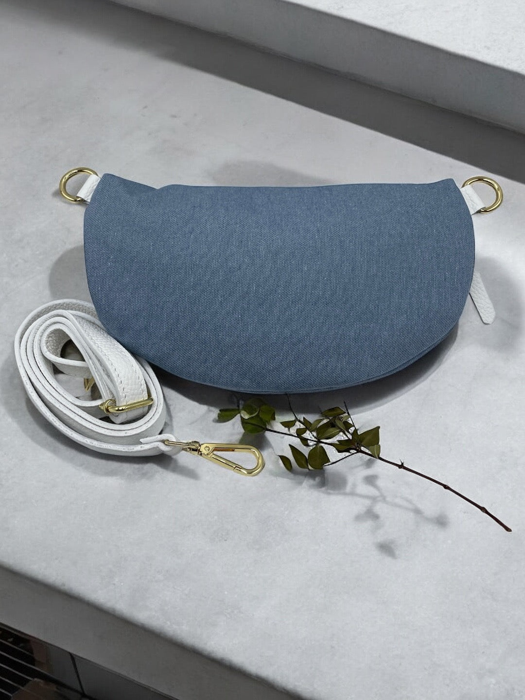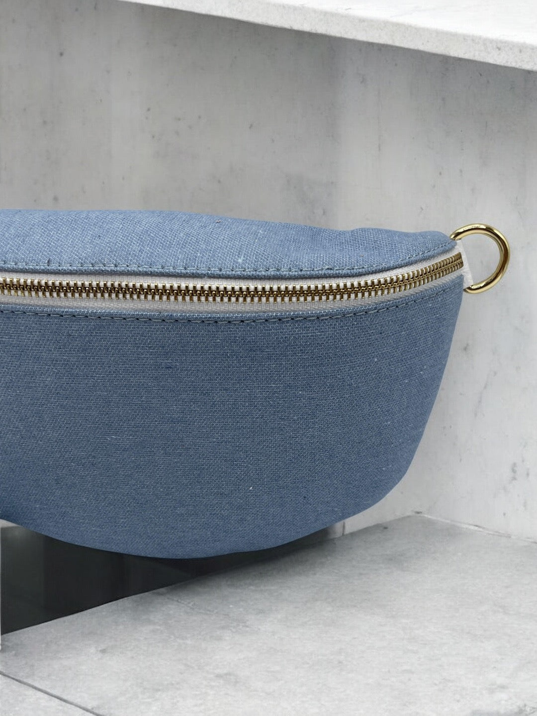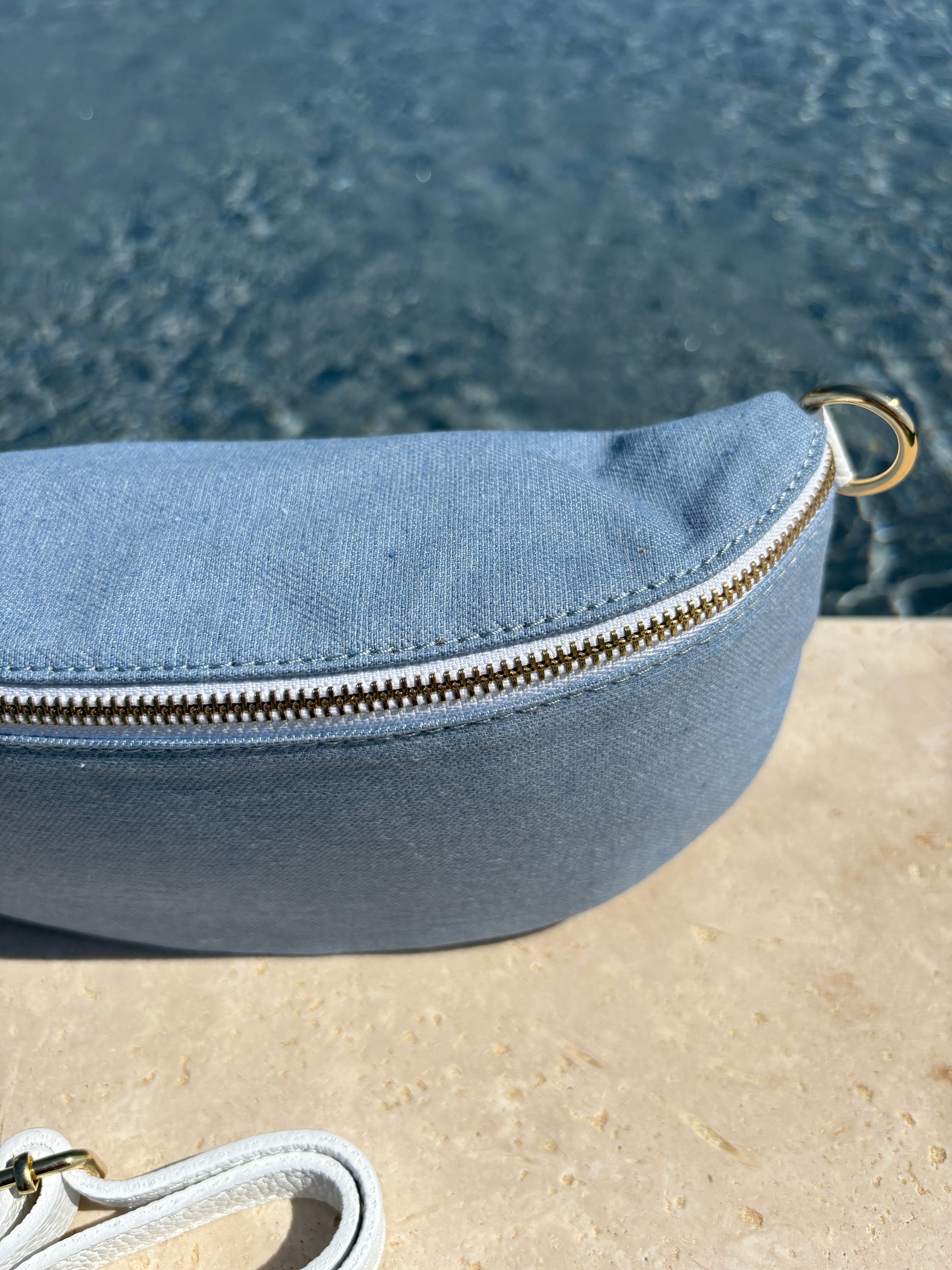 Adoptez le style décontracté et tendance avec le sac banane tissu jean bleu clair et sa bandouliere blanche en cuir !