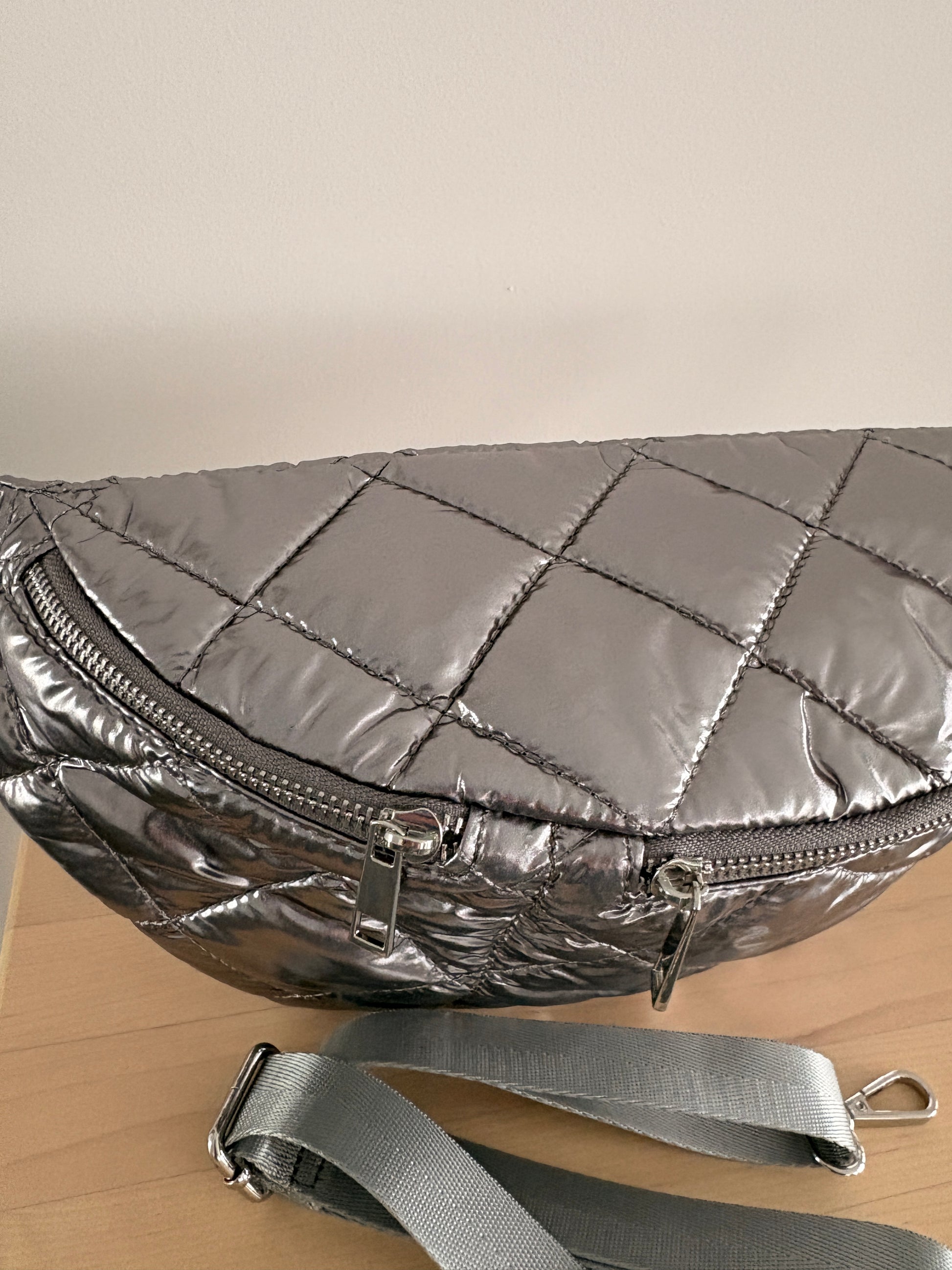 Intensifiez votre look avec ce sac banane audacieux matelassé toucher doudoune argenté !