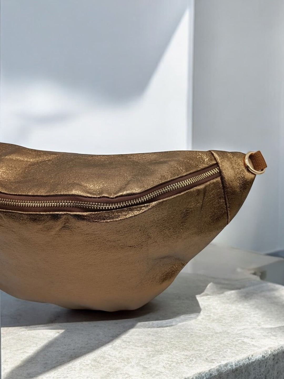 Ce sac banane est de couleur bronze, présentant une texture légèrement brillante. Il possède une grande fermeture éclair en métal doré sur le devant, ajoutant une touche élégante. Les anneaux métalliques aux extrémités permettent d'attacher une sangle ajustable également de couleur bleue. Le sac a une forme arrondie avec un volume spacieux, parfait pour transporter vos essentiels au quotidien. La sangle large est amovible et fixée par des crochets dorés robustes.