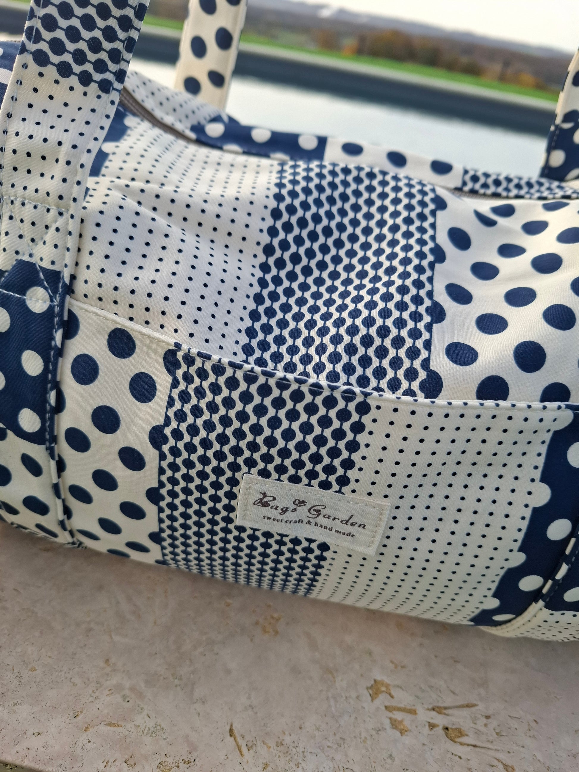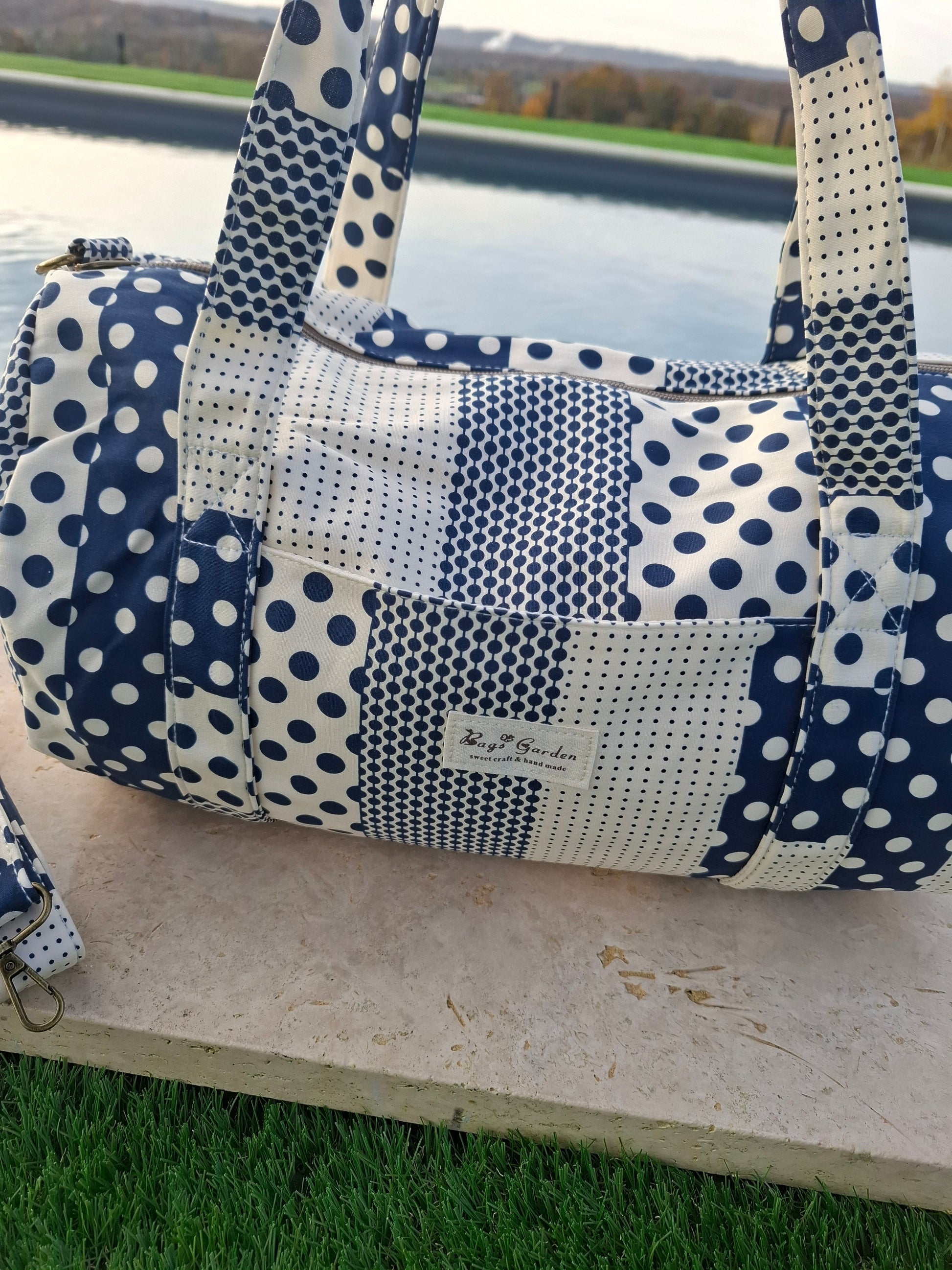 Sac polochon week end de voyage en tissu coton patchwork motifs à pois bleu marine et blanc