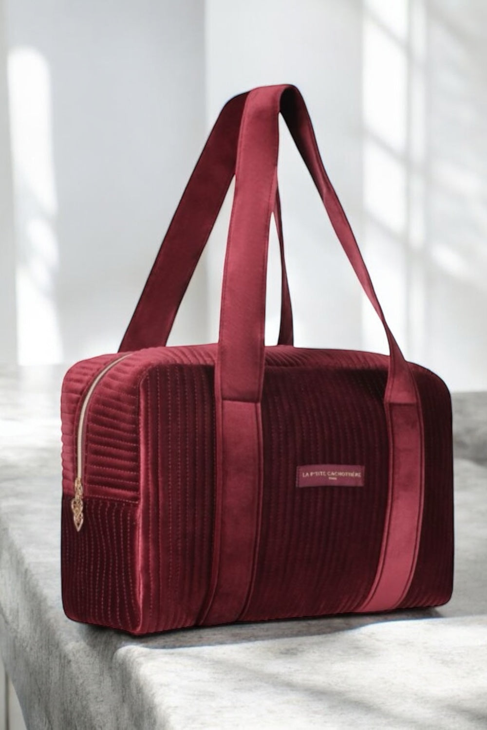 Il est entièrement coloré en rouge bordeaux en velours matelassé ajoutant une touche élégante au sac.