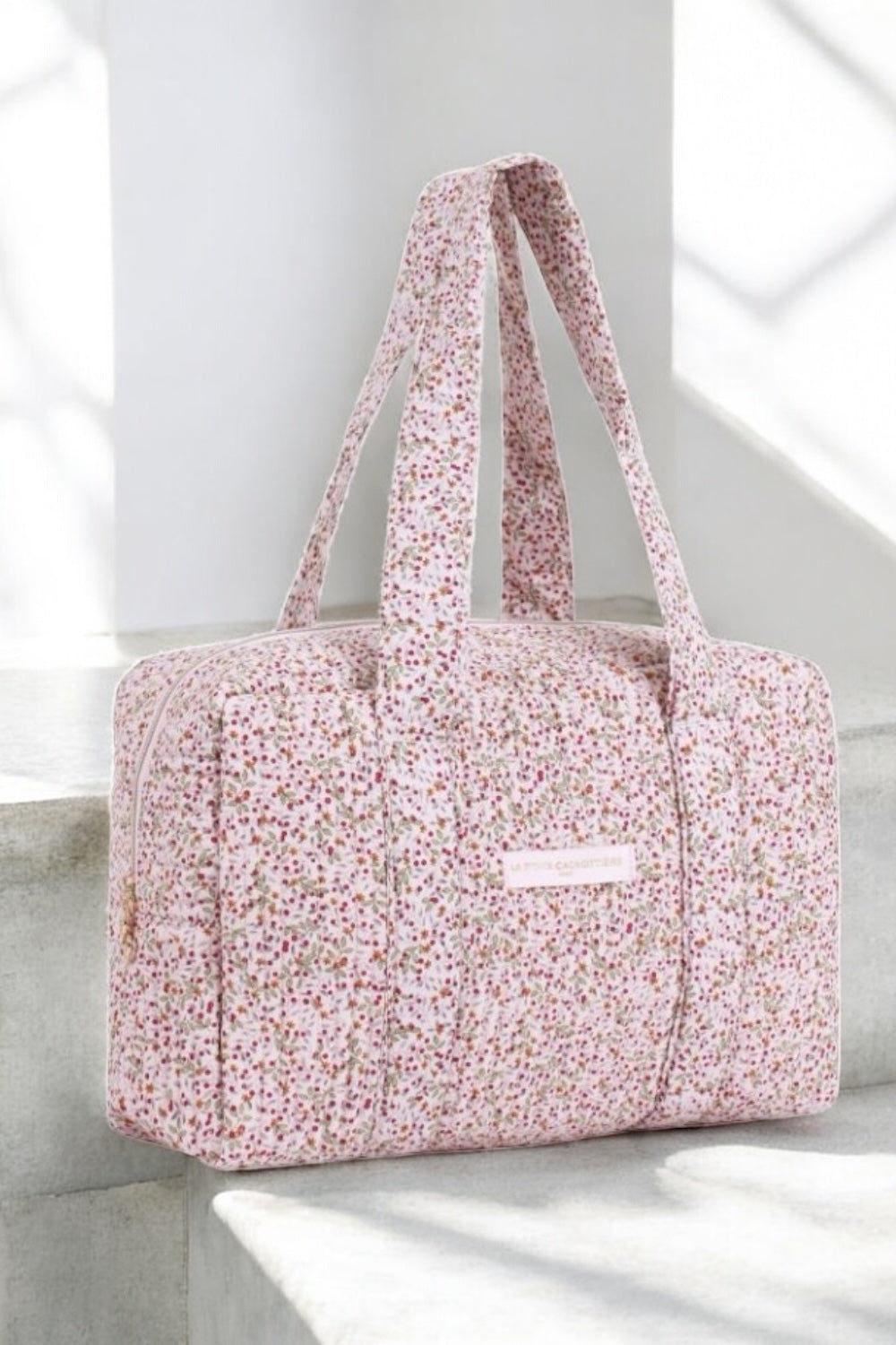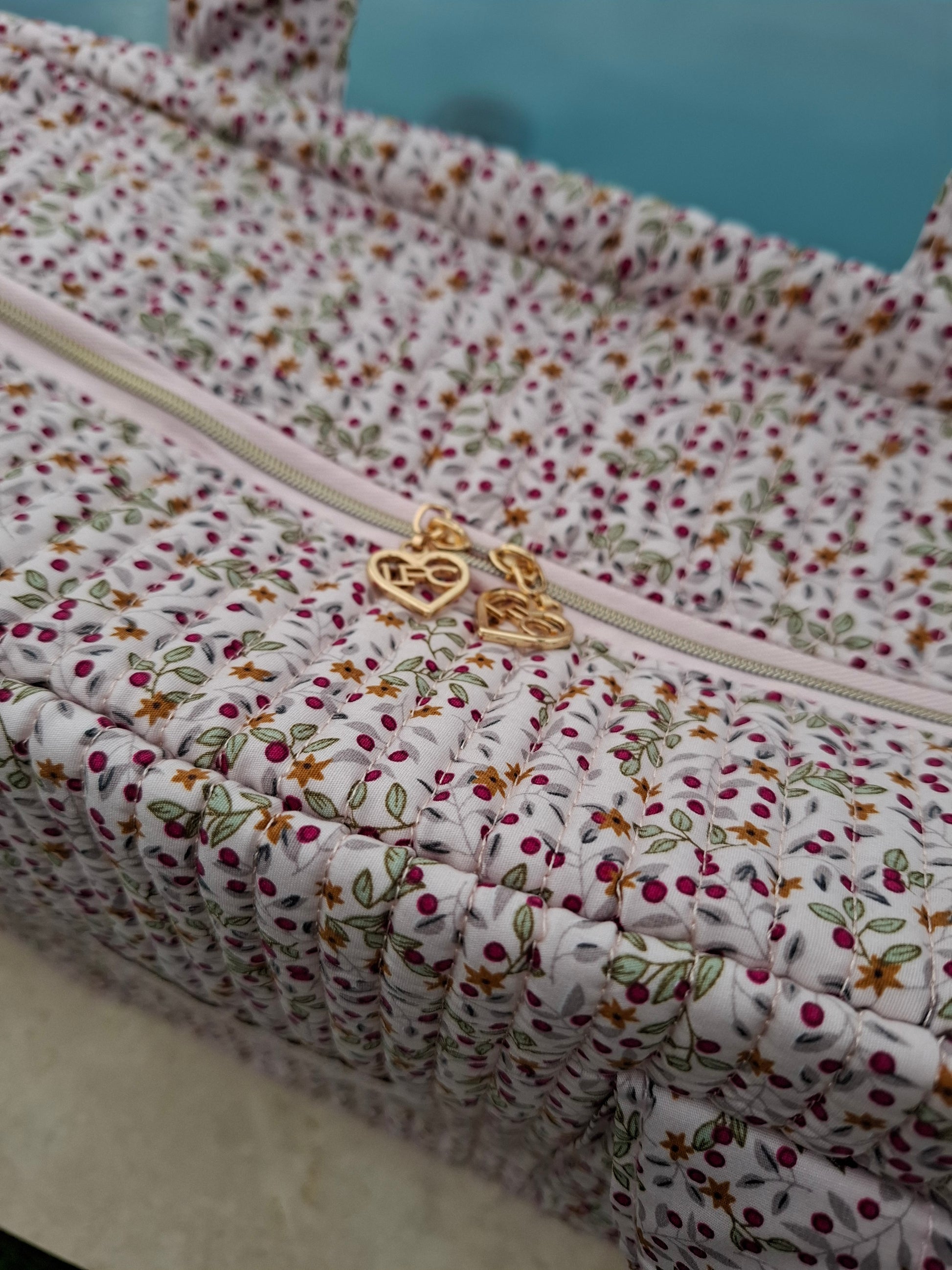 Sac week-end polochon en coton matelassé rose pâle liberty motifs cerises