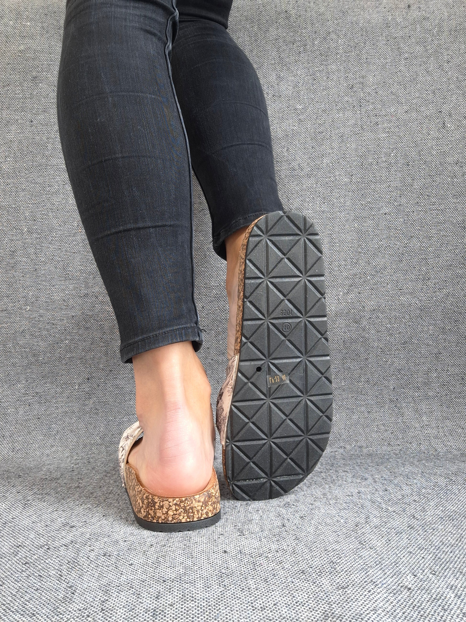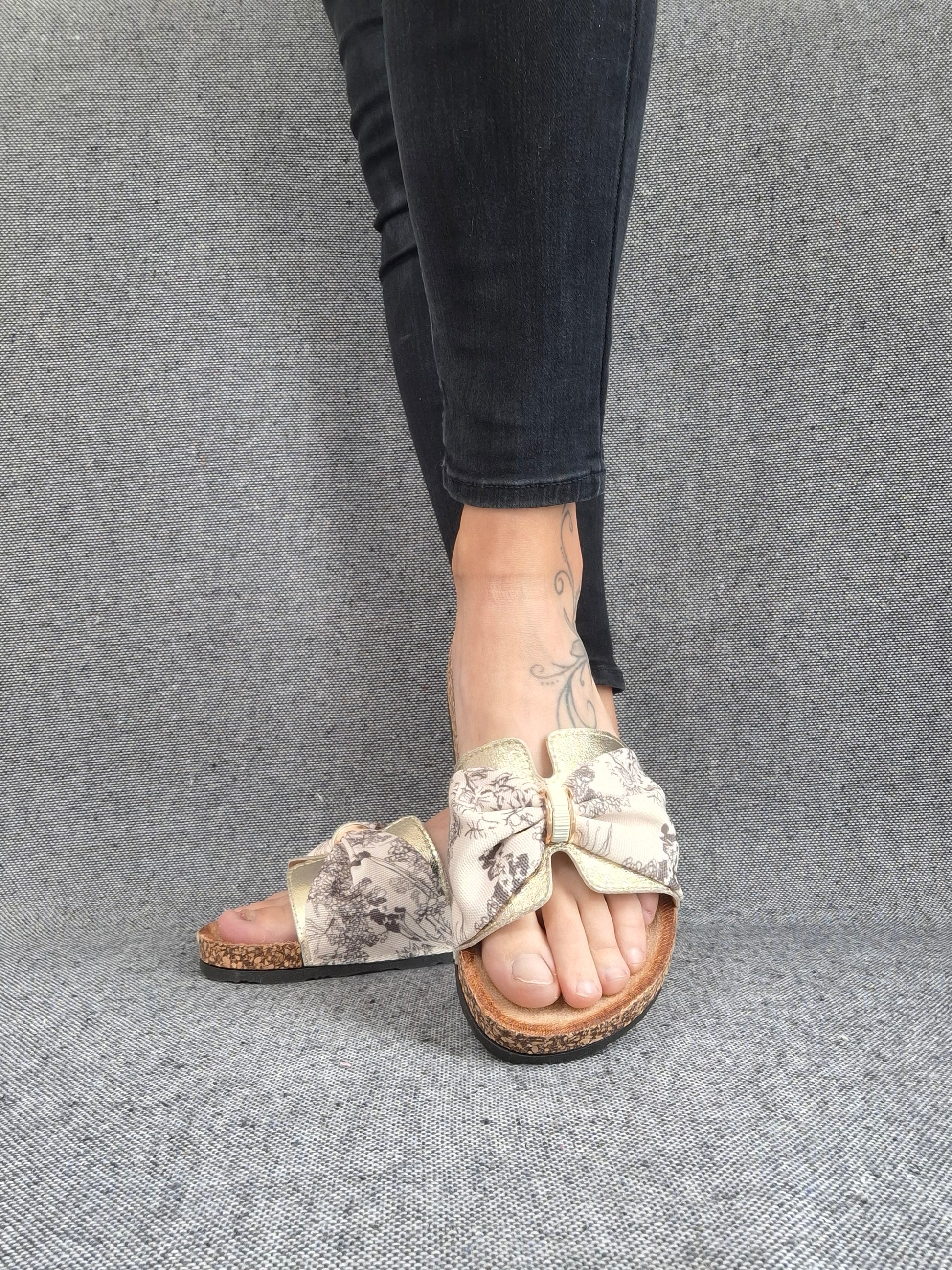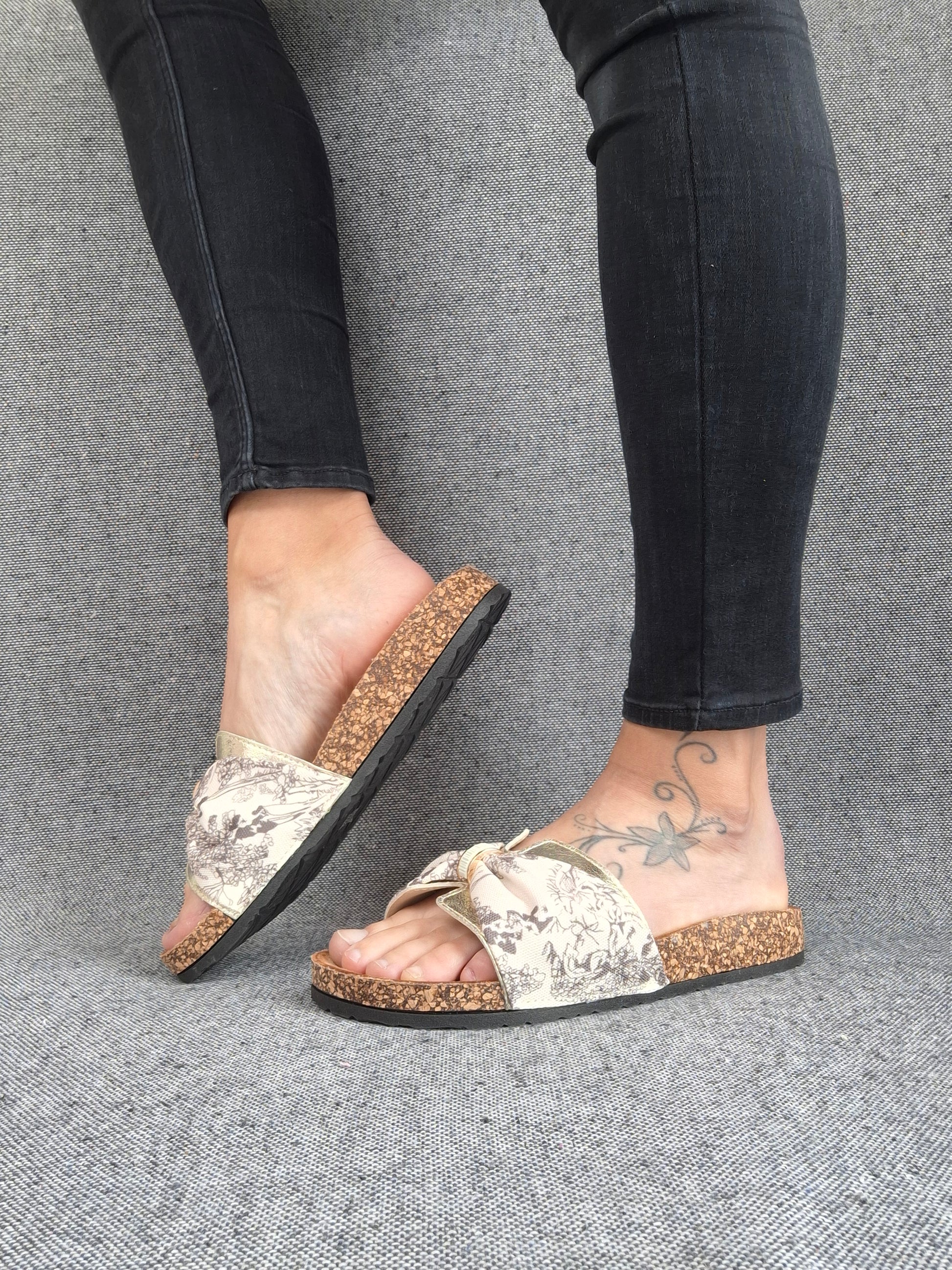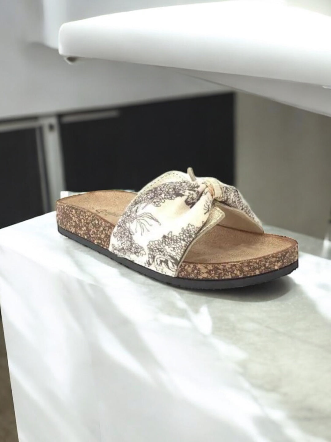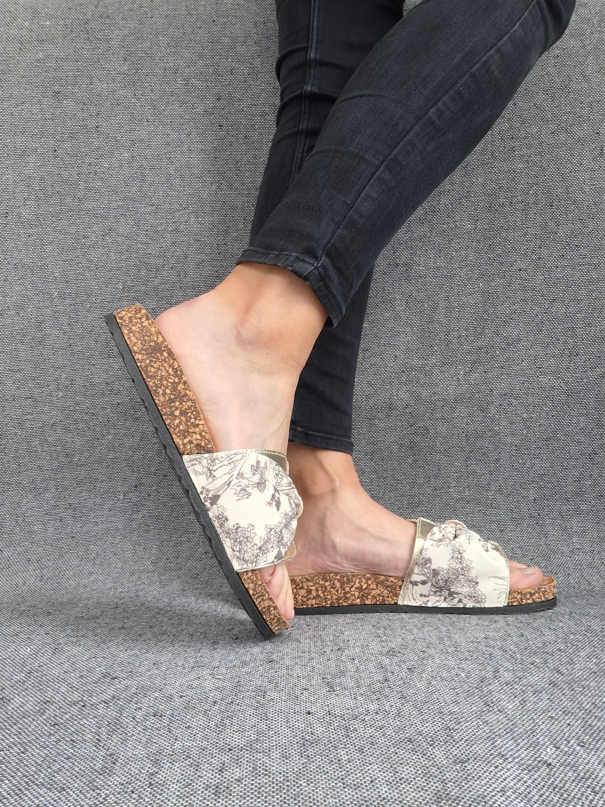 Ces sandales présentent une semelle en liège qui offre un confort optimal. La bande en tissu est ornée d'un élégant motif floral beige et blanc. La semelle extérieure est en matière noire pour une meilleure adhérence. L'assemblage de la semelle et de la bande crée un look naturel idéal pour les saisons chaudes.