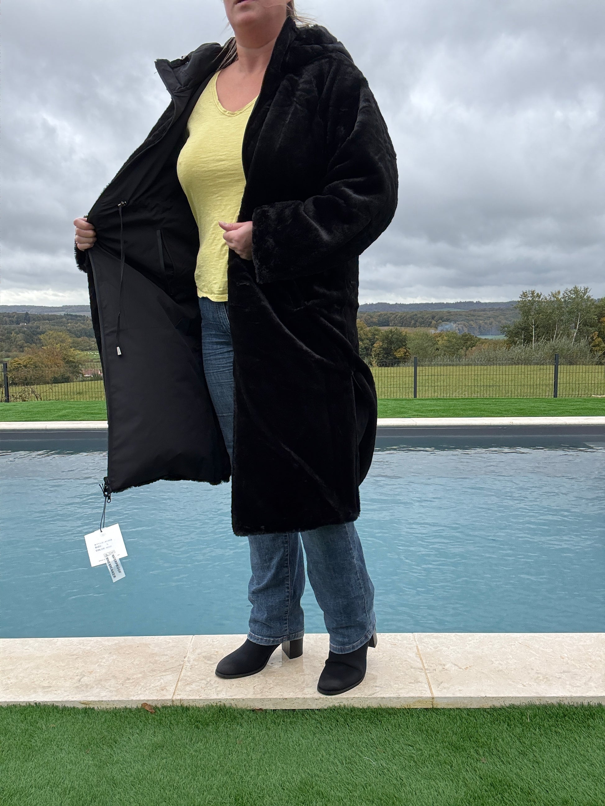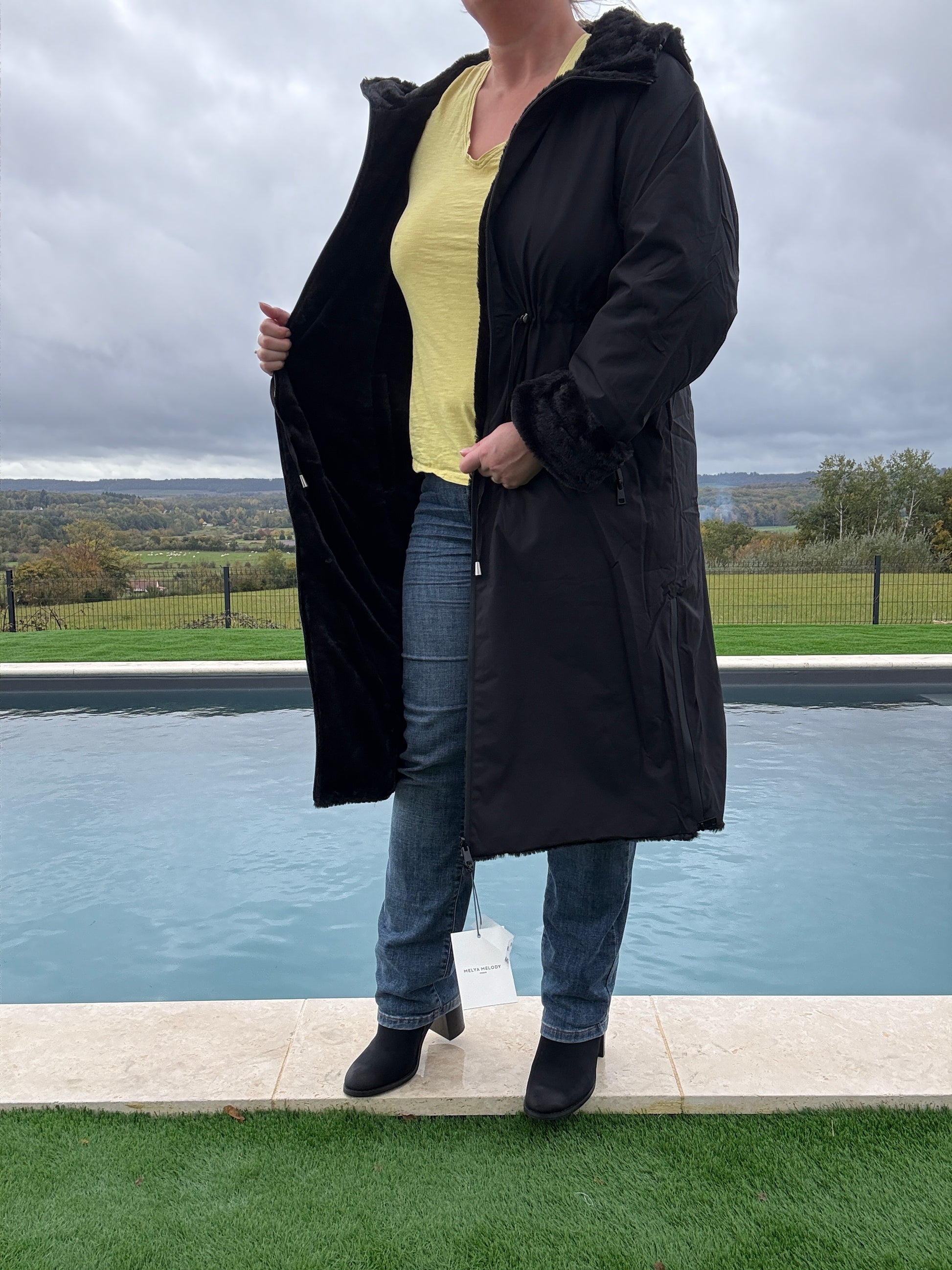 Manteau long réversible noir fausse fourrure avec capuche et cordons de serrage à la taille
