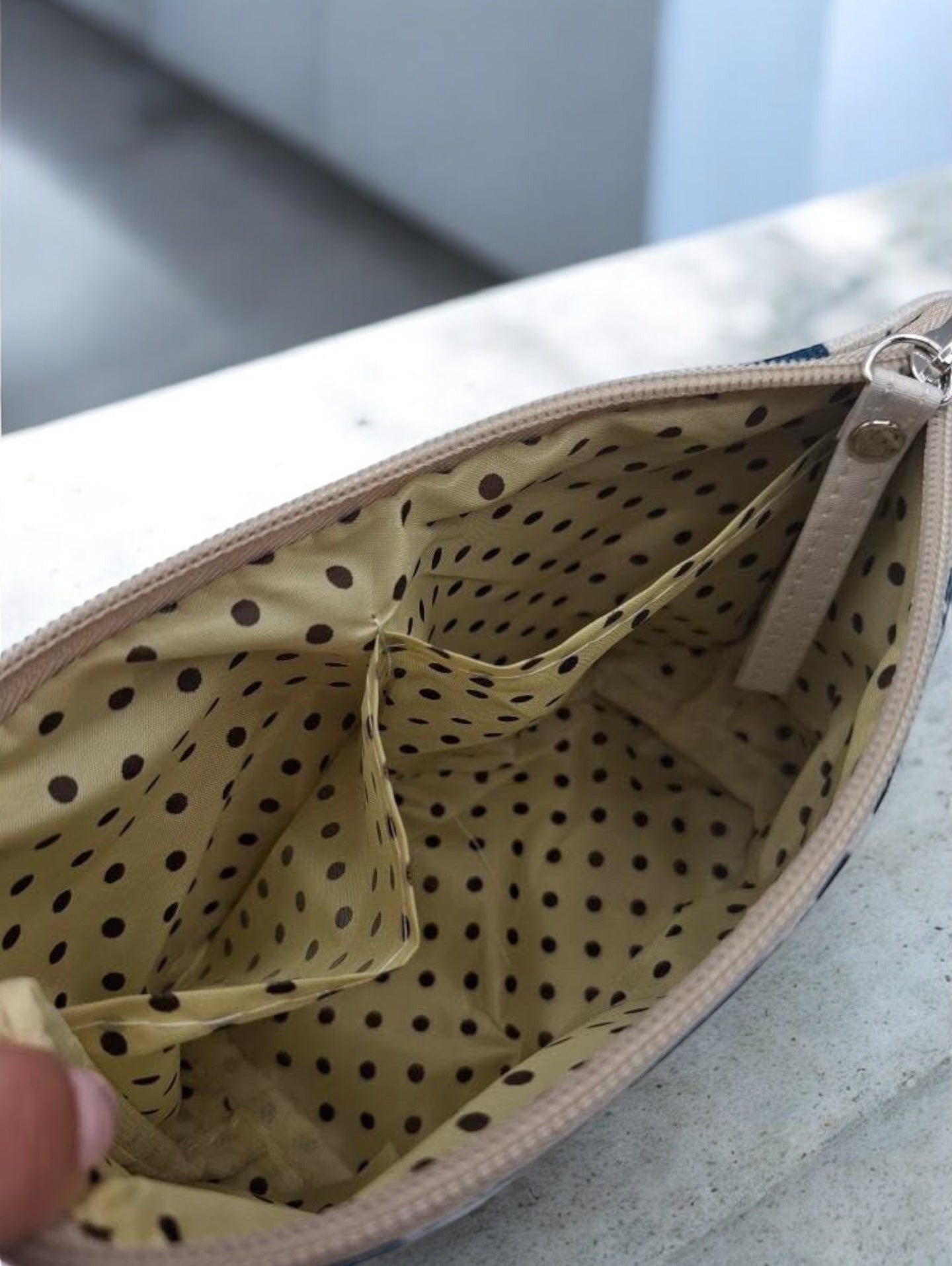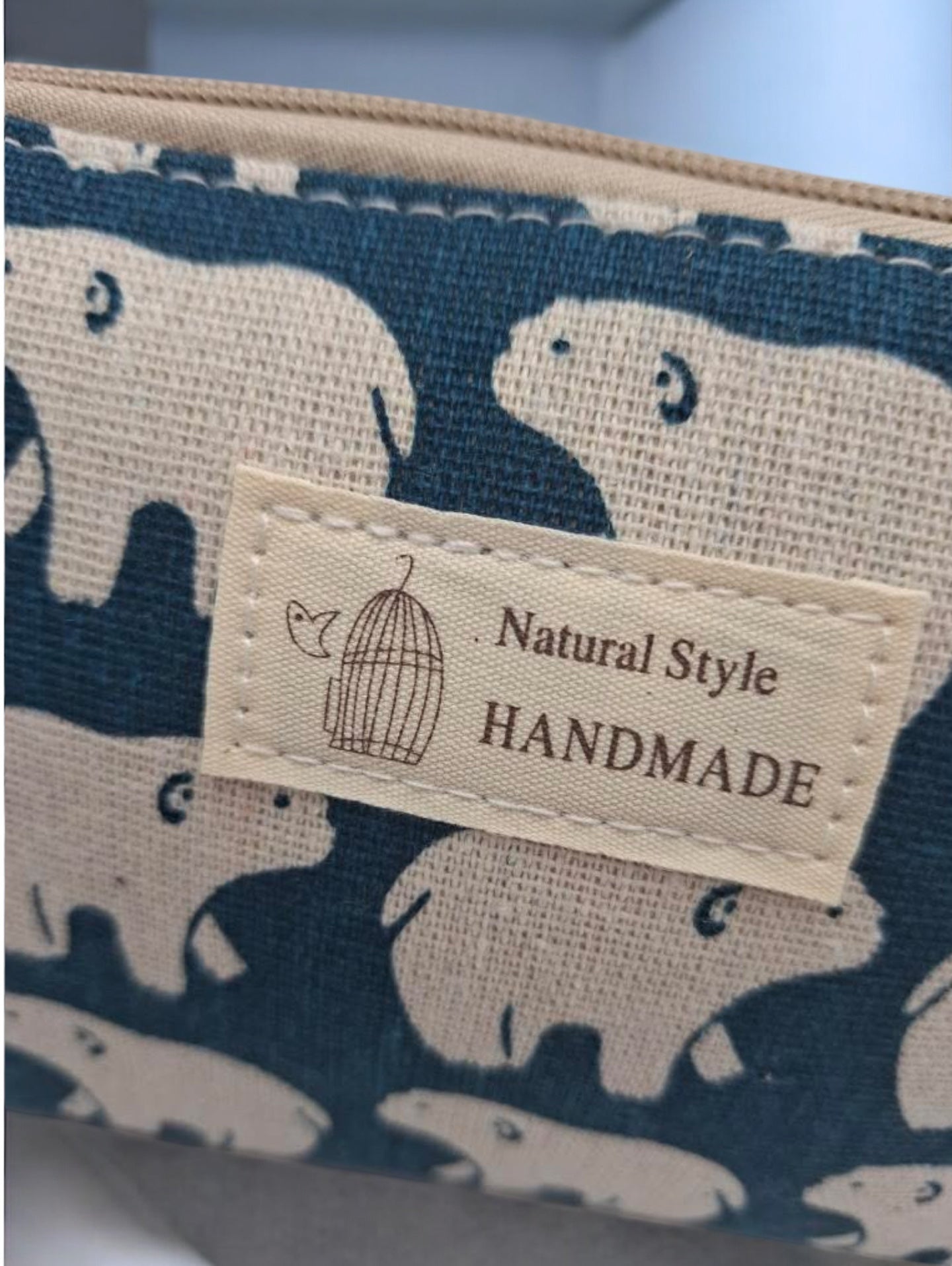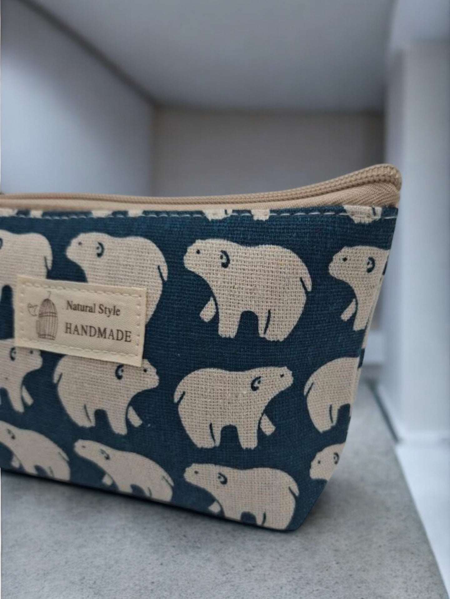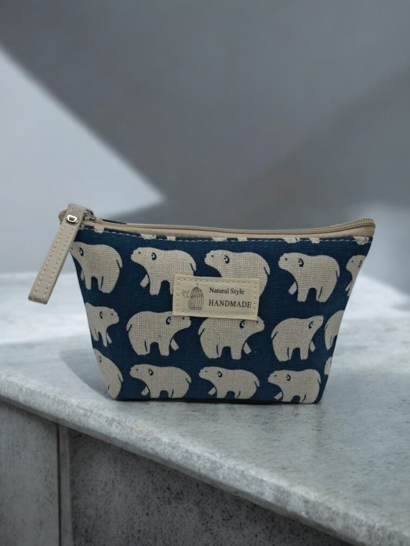 La trousse est ornée d'un motif d'ours polaires blancs sur un fond bleu. Elle possède une fermeture éclair robuste de couleur beige. La matière semble être du tissu épais et résistant. Sur le devant, une étiquette affiche "Natural Style HANDMADE" avec une illustration de cage à oiseaux.