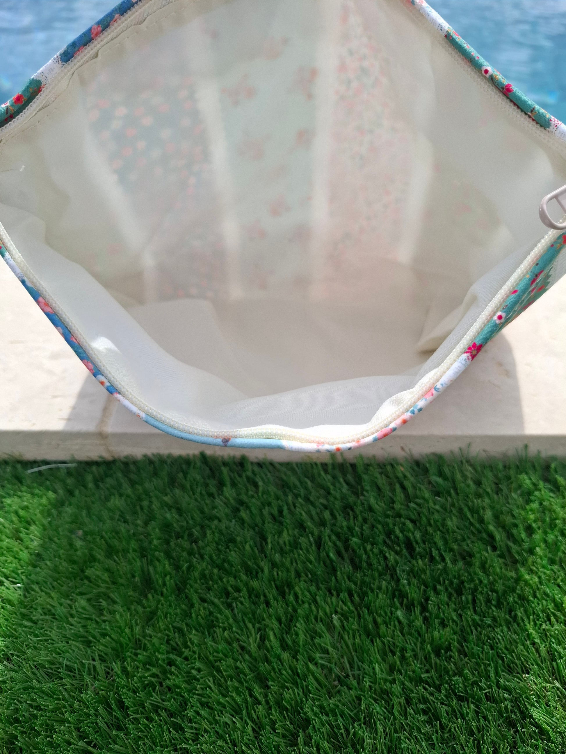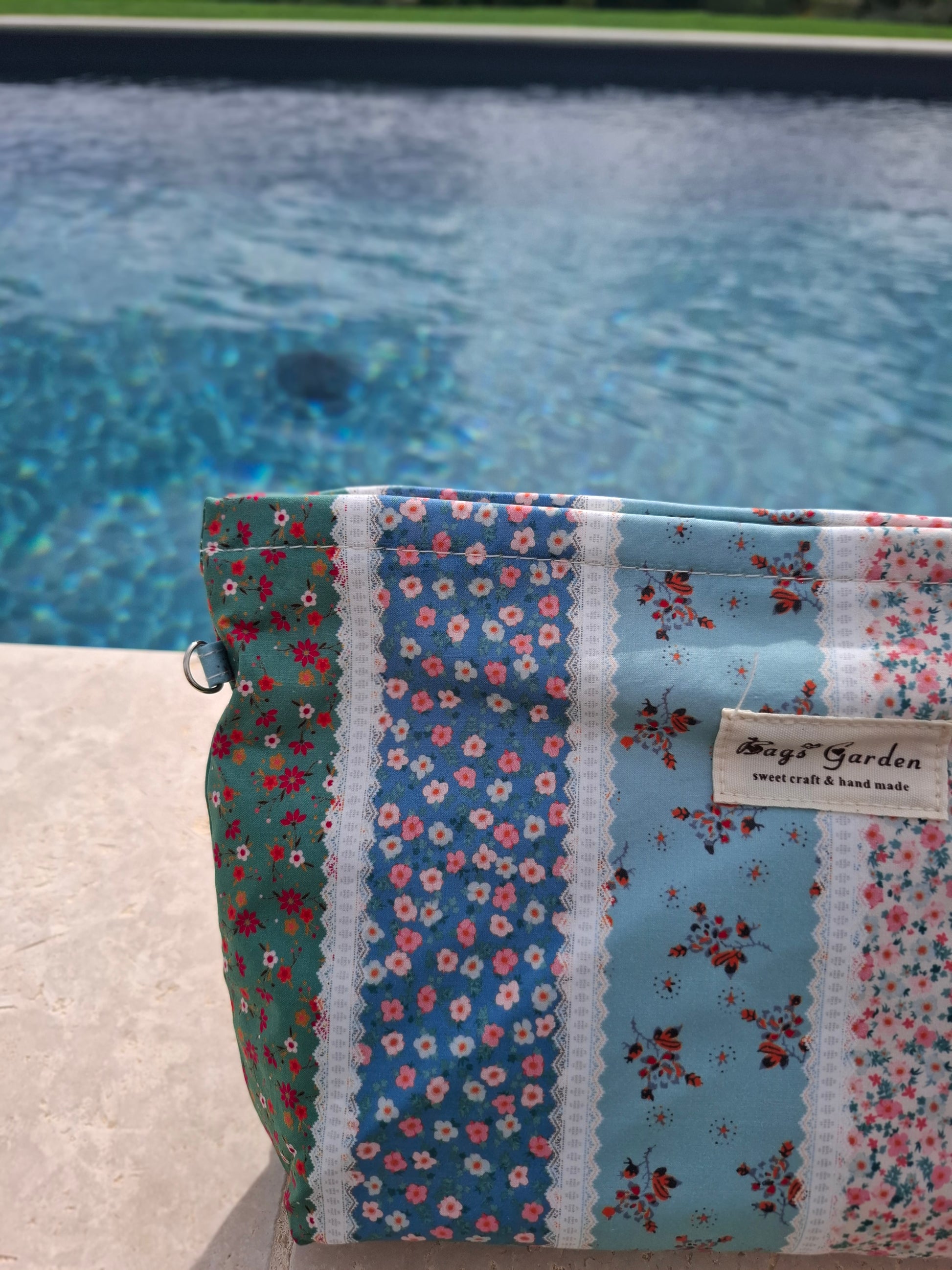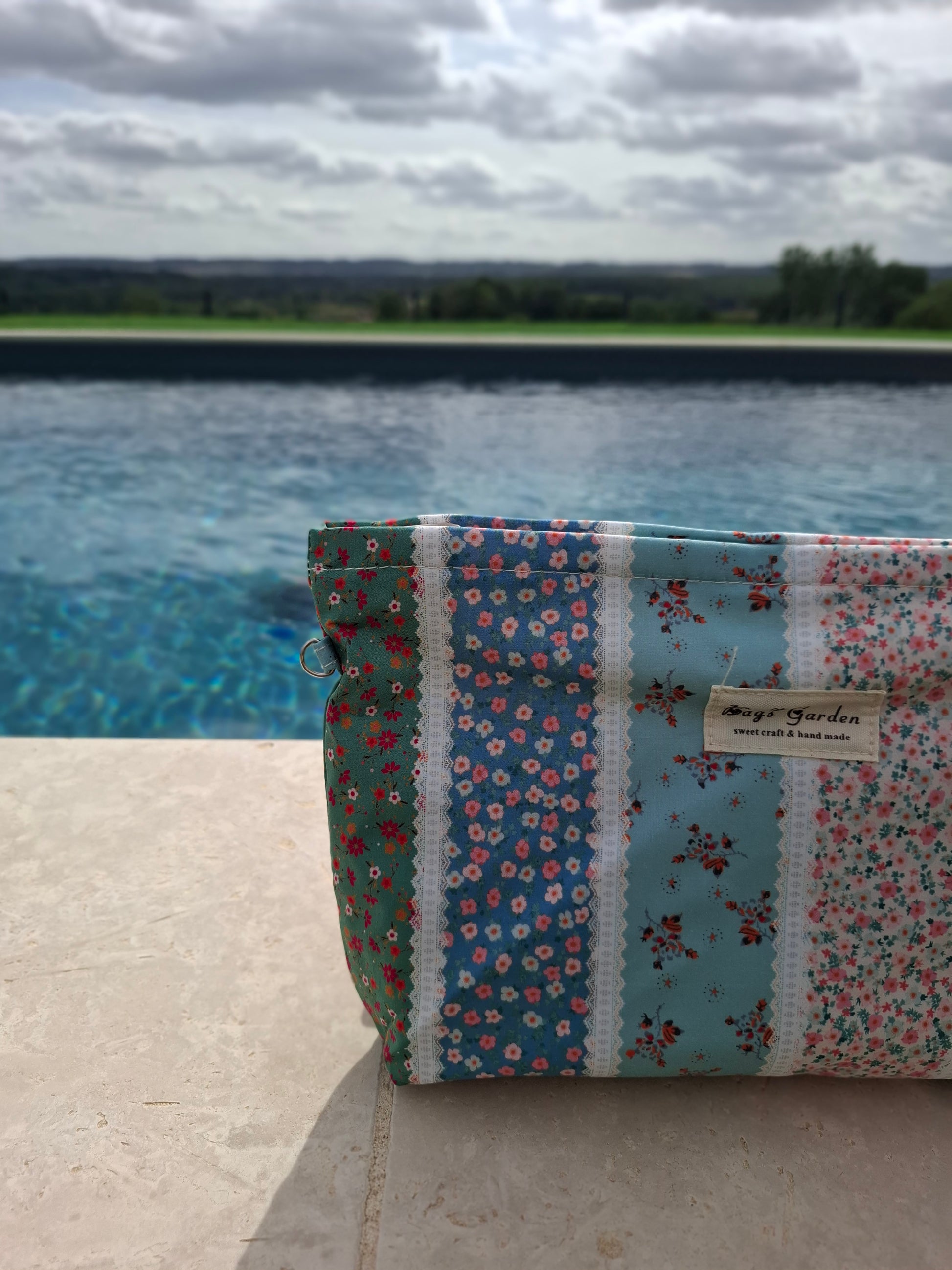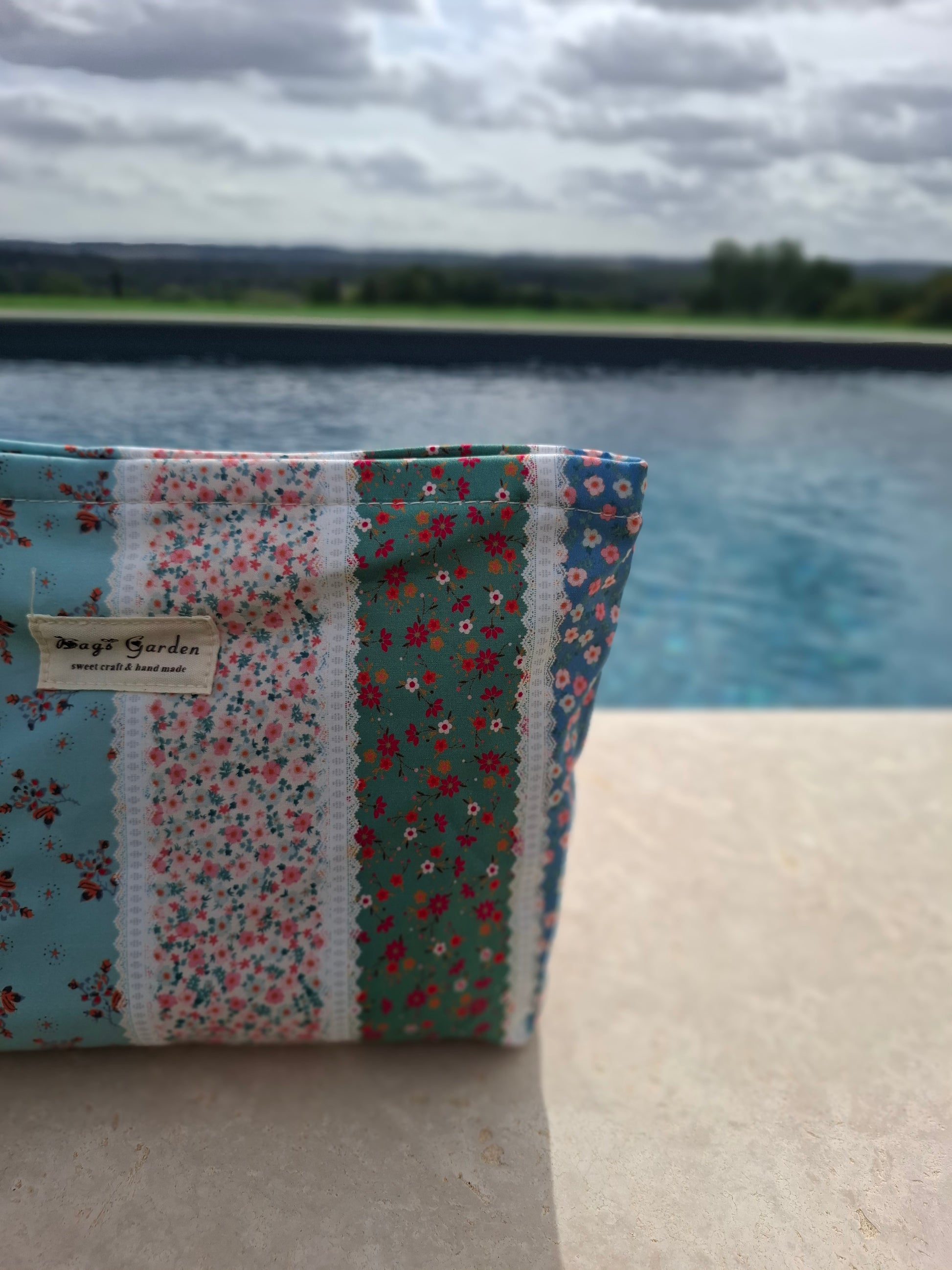 Trousse en tissu imperméabilisé motifs patchwork à rayures florales bleu rose et vert
