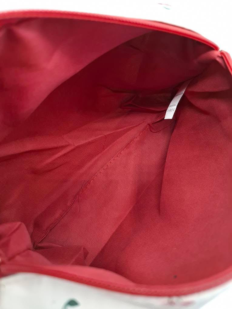 La trousse est de couleur blanche et ornée de petits cœurs rouges dispersés sur toute sa surface. Elle possède une fermeture éclair rouge avec une tirette dorée qui ajoute une touche élégante.