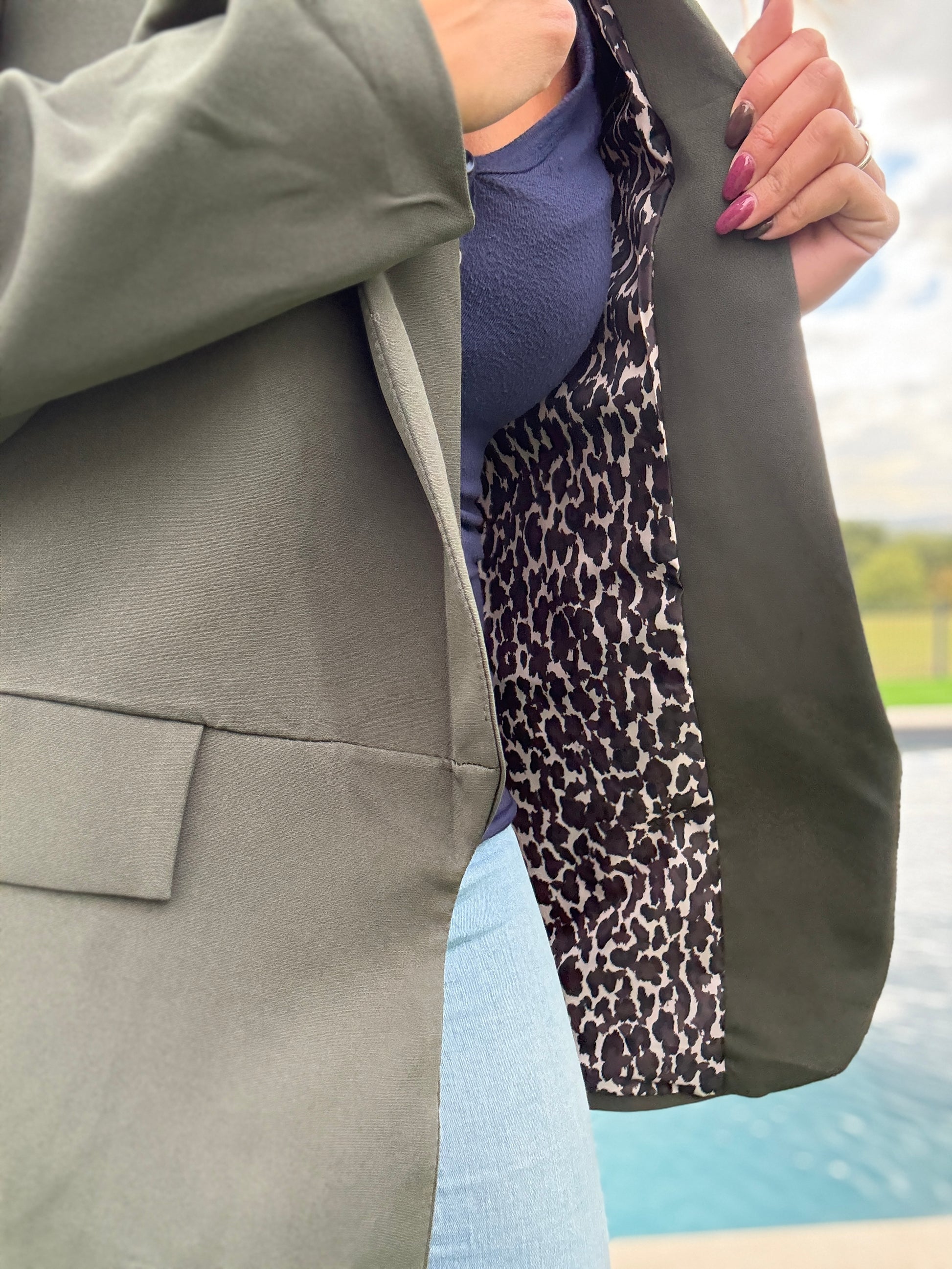 Le blazer est de couleur vert kaki, offrant un style classique et intemporel. Les manches présentent des revers imprimés léopard qui ajoutent une touche originale et audacieuse. Il est muni de deux poches à l'avant, pratiques et esthétiques. Sa coupe semble décontractée, idéale pour diverses occasions, qu'elles soient formelles ou décontractées.